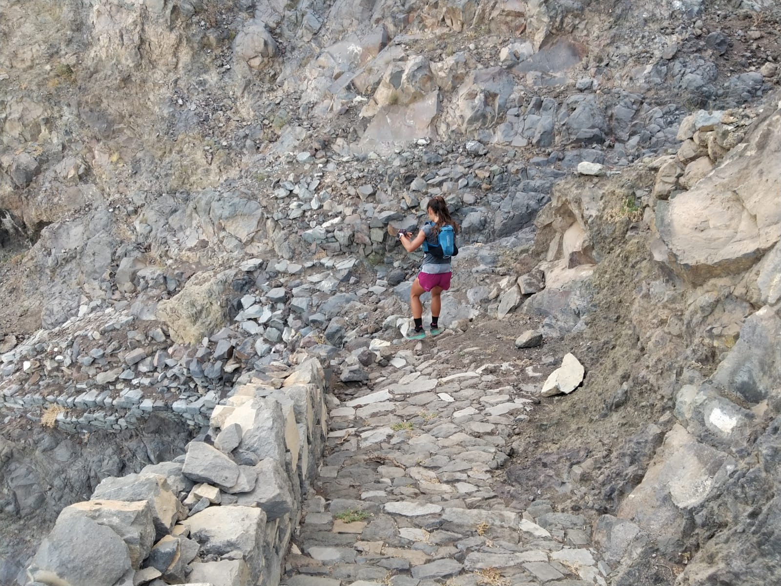 Manon est dans le même cas que moi, et on ne se rassure pas trop mutuellement une fois là haut, quand on réalise le peu d’eau qu’il nous reste et le chemin restant avant le prochain CP … ok, ça va aller, le corps est solide ! Sauf que c’était sans savoir qu’on se retrouverait une nouvelle fois dans un grand moment de panique .. !