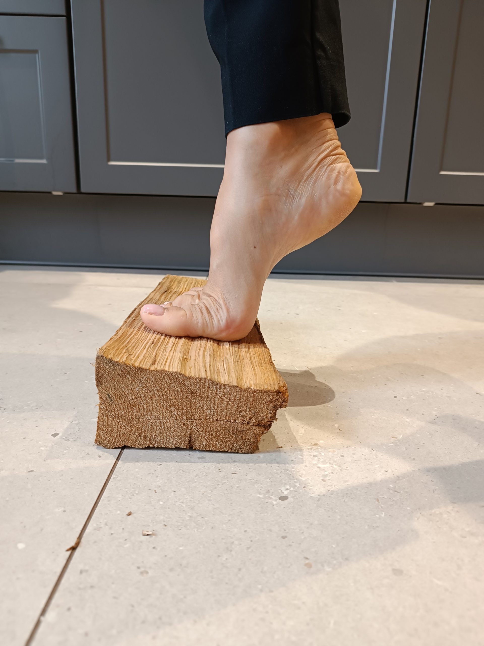 Une variante plus complexe consiste à faire le tour des pieds. A partir de la position debout et en appui sur les orteils, descendez sur les talons l’extérieur du pied avant de remonter par l’intérieur de la voûte sur les orteils.