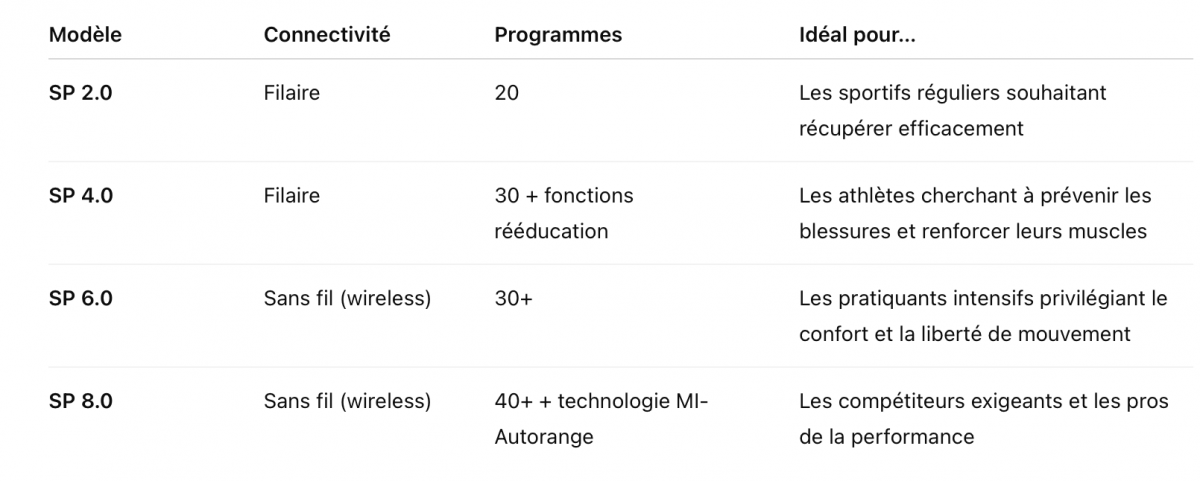 La gamme Compex SP se décline en quatre modèles : SP 2.0, SP 4.0, SP 6.0 et SP 8.0.