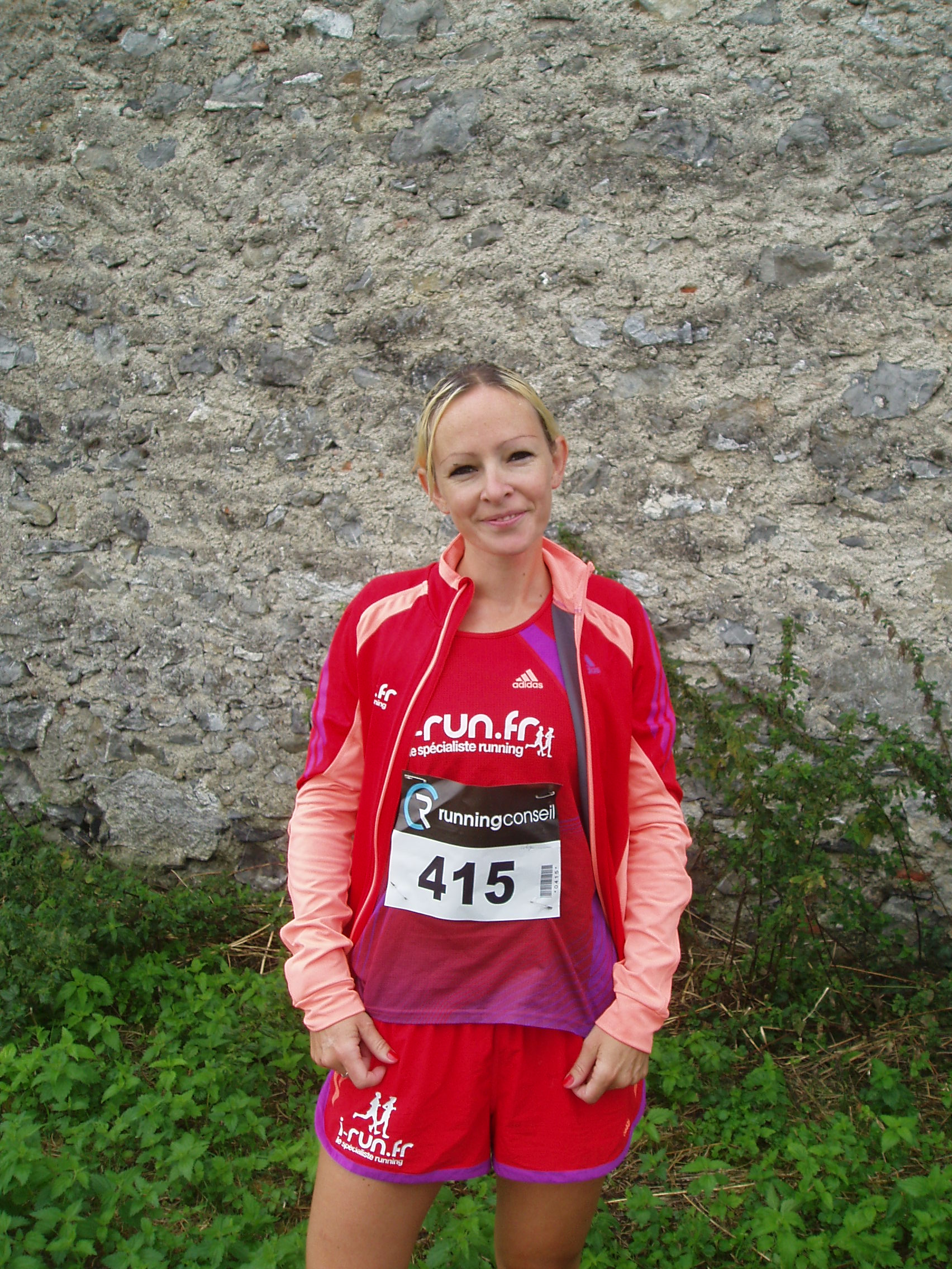 On enfile les tenues I-run : short, tee-shirt, basket et K-way !!! Ça faisait longtemps qu’il n’était pas sorti celui-là…. Heure de départ 10h. Quelques minutes d’échauffement…on ne va pas user trop de forces pour la reprise !!! Le starter appelle les coureurs, c’est parti ! On part tranquille, hein Céline…