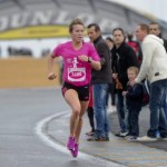 Je suis arrivée tôt sur le circuit des 24 heures, mais les parkings étaient déjà pris d’assaut et une déferlante rose noyait les abords ; je me suis retrouvée à stationner un peu loin et j’ai donc décidé de me rendre « en tenue » sur les lieux de la course car je n’avais pas noté de consignes la veille en retirant mon dossard. 800 m de marche et me voilà sur site. 8500 femmes en rose plus les accompagnateurs, ça fait du monde ! il faut se frayer un chemin pour parvenir au départ, mais pas besoin de chercher, suffit de suivre la file. Pour le moment le temps se maintient, malgré quelques nuages gris qui défilent paresseusement, le ciel reste clément.