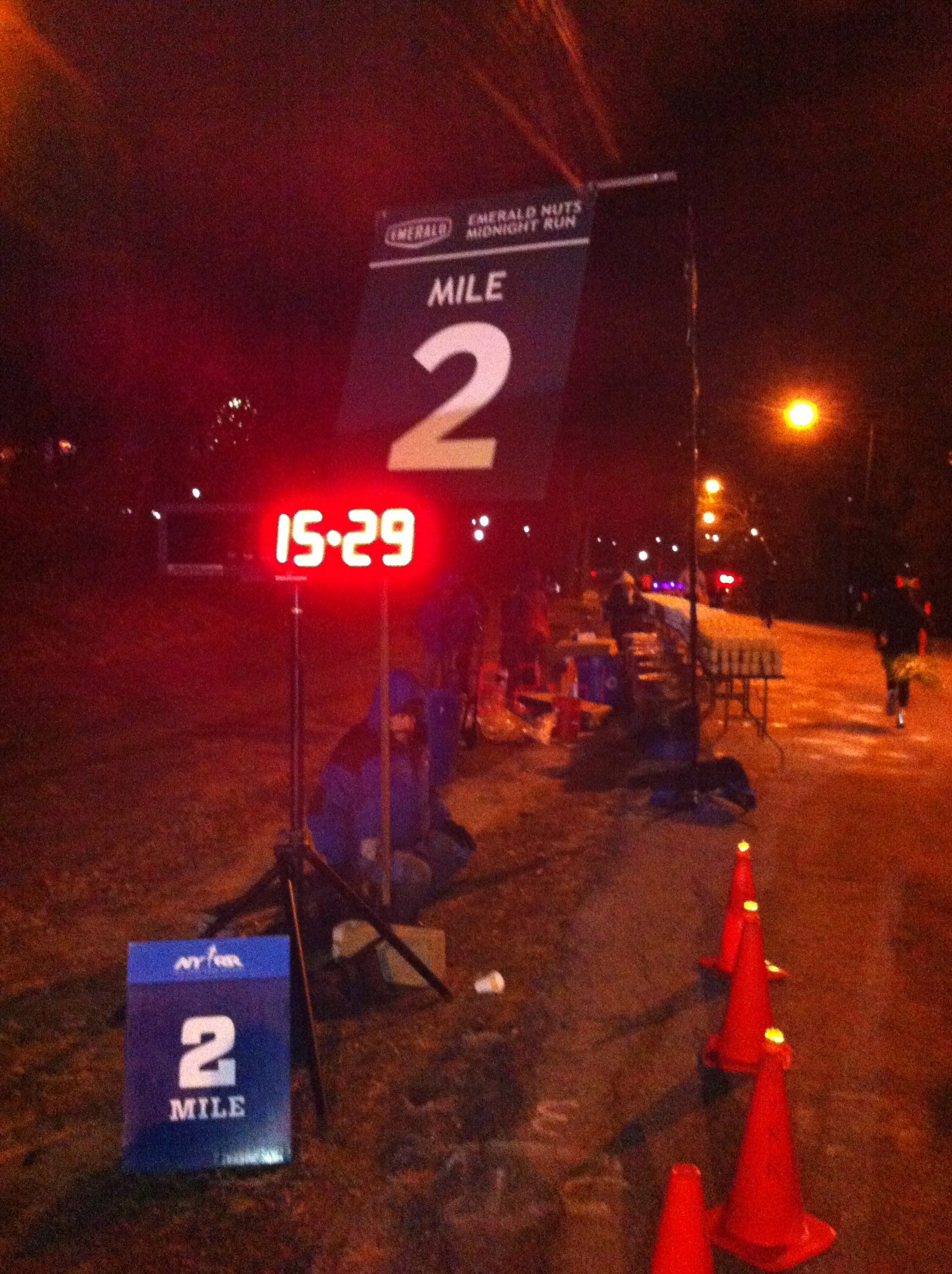 C’est parti très vite devant !! On se cale à un petit rythme de croisière qui nous permet de profiter de l’ambiance et de savourer ce moment présent. Il fait très très froid mais les plus à plaindre sont plus les spectateurs que les coureurs. Ils sont statiques et pourtant nous encouragent chaleureusement en tendant leurs mains pour taper dans les nôtres : « Go runners, you inspire me !! » C’est vraiment touchant d’entendre ça. Typiquement américain ! Ceux qui ont eu la chance de participer au marathon de New York comprendront sûrement ….on arrive vite au 2ème miles, là où se tient le ravitaillement. Ravitaillement de luxe, il a mis sa robe de soirée lui par contre ! Au menu, verres de cidre, verres de champagne, il faut absolument prendre le temps de s’arrêter pour trinquer ! « Cheers !!! « Pas de bol, le contenu des verres a gelé, impossible de boire. Quelques mètres plus loin, un DJ aux platines, des spots de toutes les couleurs, des énormes enceintes pour mettre le son, c’est bon ! On aurait presque envie de s’arrêter là pour finir la soirée ! Mais nous ne sommes qu’à mi chemin … Et le froid nous saisit au moindre petit arrêt !