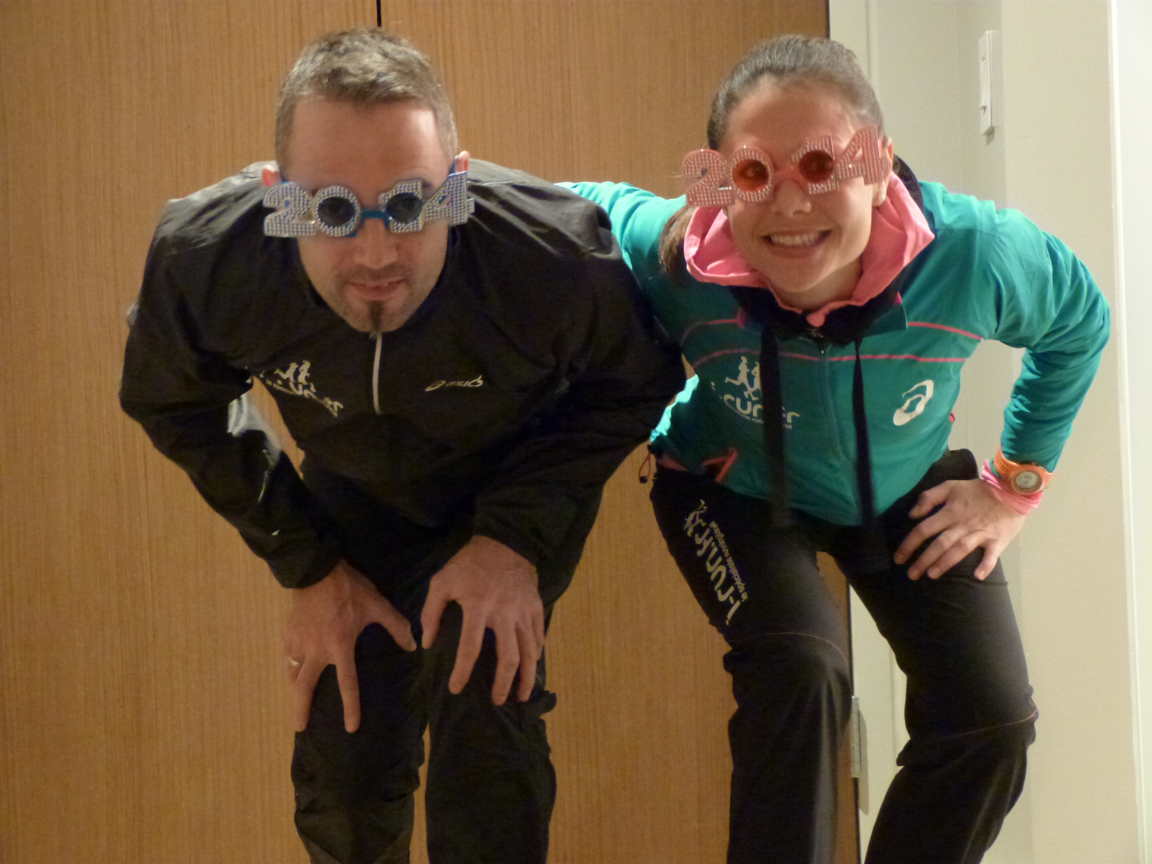 L’organisation nous a donné RDV à 23h à la tente élites pour récupérer nos dossards. Il faudra quand même expliquer que nous ne venons pas pour nous faire mal ni tenter de battre des records ou faire de l’ombre à ceux qui cherchent à en faire …d’une part, nous ne sommes vraiment pas en condition pour espérer une performance sur cette distance rapide de 4 miles (6km400), et d’autre part, nous souhaitons profiter de l’ambiance attendue et juste partager quelques foulées symboliques pour ce mythique passage à la nouvelle année. Bref, on vient pour s’amuser comme de nombreux autres participants d’ailleurs. Mais avec nos supers lunettes : « 2014 » sur la tête, ça devrait vite se voir en fait ! D’ailleurs j’ai prévu de courir avec l’appareil photo et Manu avec la caméra.