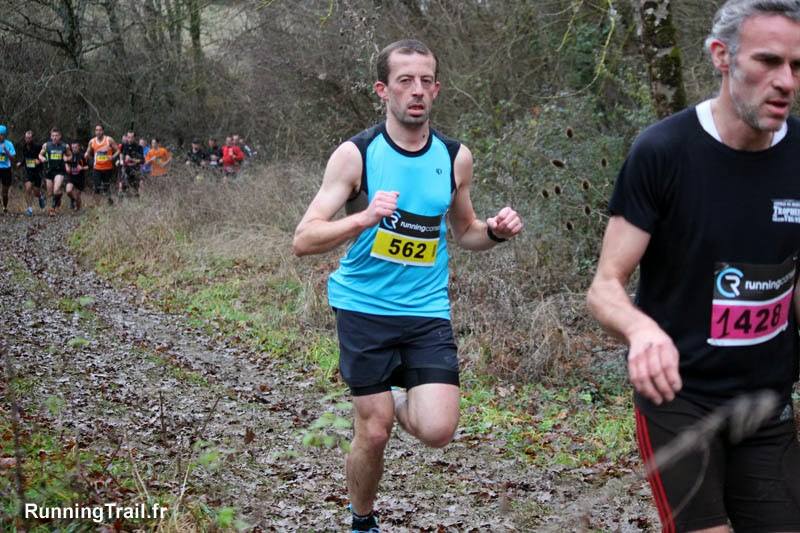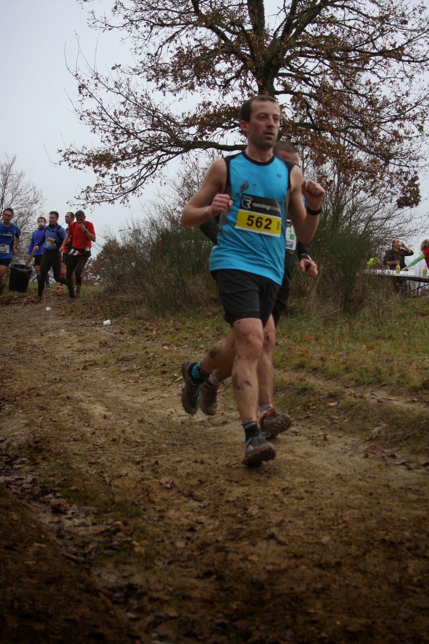 15 heures pétantes et c’est parti pour 12 km. Je ne connais pas du tout le parcours, mais je profite d’un 1er km descendant pour commencer à gratter quelques places et à me faufiler vers ceux qui semblent avoir une vitesse de croisière qui me convient. Au bout d’1 km de route, 1er bip de ma montre. Je regarde ce qu’elle me dit : 3min37s pour le 1er km, soit du 16,7km/h !!! Et bien, moi qui avais eu l’impression de partir tranquille, c’est encore loupé !! Le 2ème km est plat, et on commence à arpenter les 1ers chemins. Comme il a plu abondamment dans la nuit, le terrain est boueux, mais pour l’instant tout à fait carrossable même pour ceux qui sont en « pneus slick » 😉 Arrive le 3ème km, et là ça commence à vraiment être boueux, et je vois que ceux qui sont devant moi n’ont pas de bons appuis, et essaient de se caler dans la trajectoire de celui de devant. Perso je suis aux anges, et l’accroche de mes nouvelles chaussures de trail (merci papa Noël) est tout simplement bluffante ! (Inov-8 X-Talon 212)