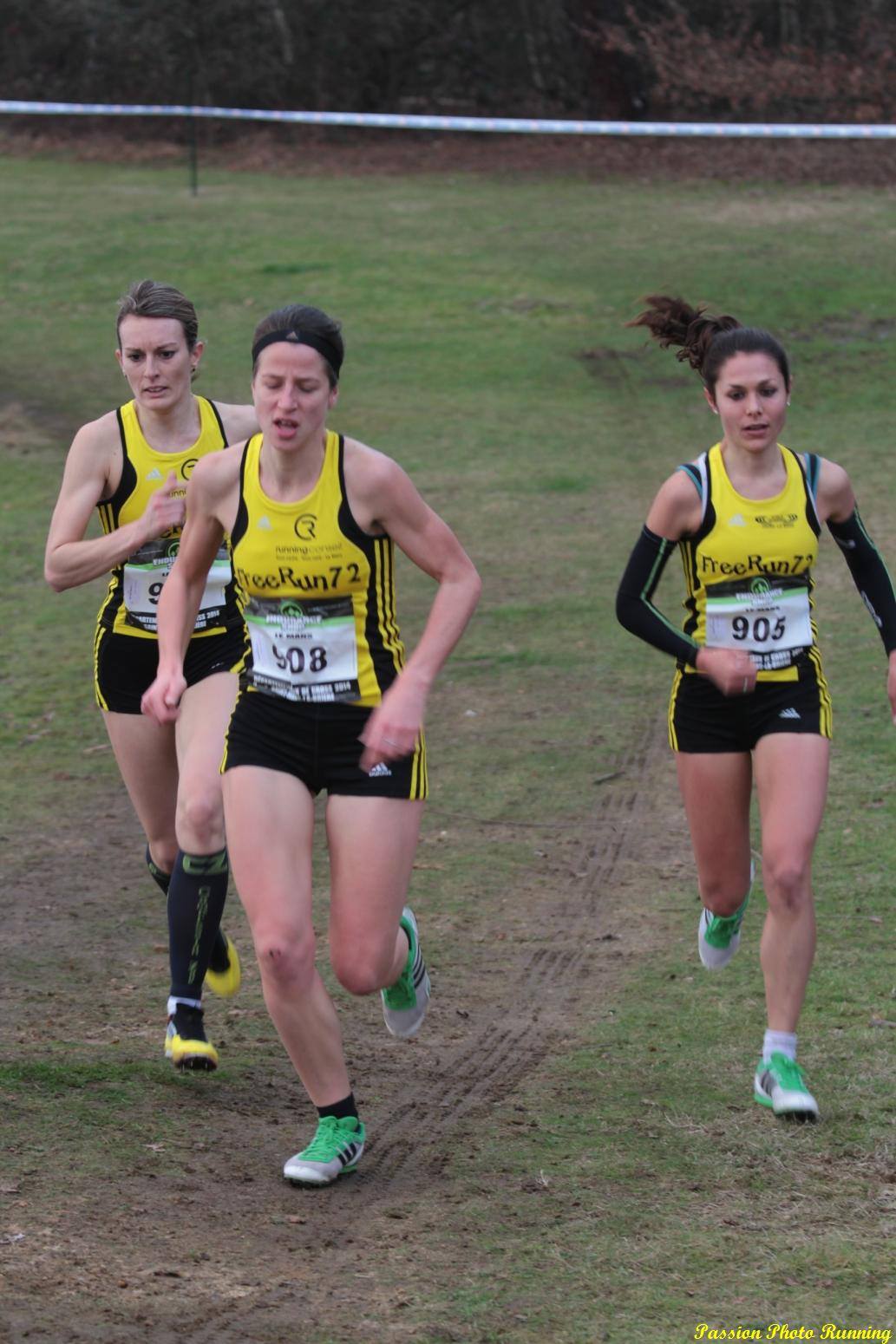 Pointes alignées derrière la ligne, silence total, quelques spectateurs derrière les barrières, le speaker lève le bras, pistolet à la main … C’est trop bon ce moment là !! A peine le temps de savourer, le départ était donné. Je pars en seconde ligne, j’ai laissé les filles qui visaient la perf profiter d’être devant. J’ai d’ailleurs opté pour un départ prudent. Enfin un départ de cross n’est, de toute façon, JAMAIS lent !! Ça va vite, mais modérément …Séverine est partie comme une flèche avec les gazelles d’Endurance 72, j’essaye de garder le groupe avec Nono et Marion en ligne de mire, en me disant que j’essaierais de recoller si les jambes (et le souffle) le permettaient plus tard. Pas de panique, il y a quand même 6km.