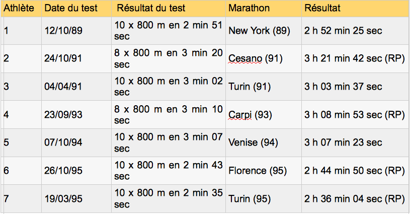Elle réunit tout de même les critères nécessaires à la réalisation d’un bon test : validité, précision, objectivité et surtout reproductibilité. De plus, elle ne demande aucun temps supplémentaire quant à sa mise en œuvre et l’analyse est immédiate. Cela peut sembler empirique, étrange voire irréaliste mais, en se basant sur les temps réalisés lors de séances spécifiques, nous pouvons avoir une idée assez précise des temps que nous valons sur un marathon, semi ou 10 km.
