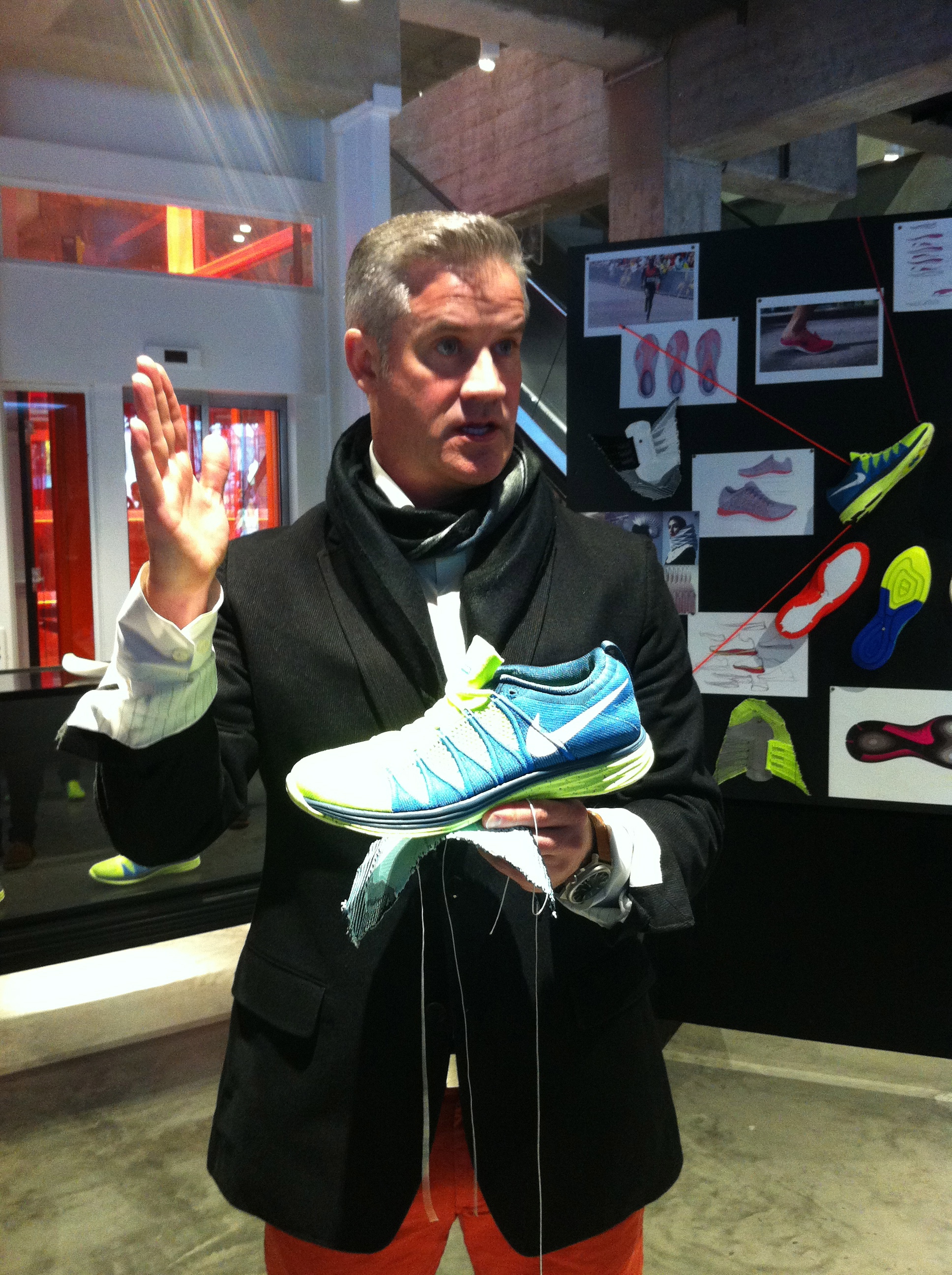 L’évènement est européen, donc ce sont des invités de tous pays qui débarquent à Berlin ce jeudi matin 6 février en matinée. Accueil chaleureux, et généreux : après une visite complète du nouveau Nike store de la ville et une petite conférence conviviale en comité restreint pour nous raconter l’histoire de la Flyknit et la manière dont la chaussure est conçue, un conseiller habillement nous emmène individuellement parcourir les rayons du magasin pour nous aider à nous équiper de la tête aux pieds. Forcément, on bave devant chaque produit … qui ne sont autres que les nouveautés du moment ! Collant, manches longues, veste coupe vent, chaussettes ou même bracelet Fuel (Nike+ Fuelband), Nike offre généreusement la panoplie complète à chacun de ses convives. Sans oublier les fameuses chaussures de running Flyknit Lunar 2, qui reste tout de même la raison première de notre venue ici.
