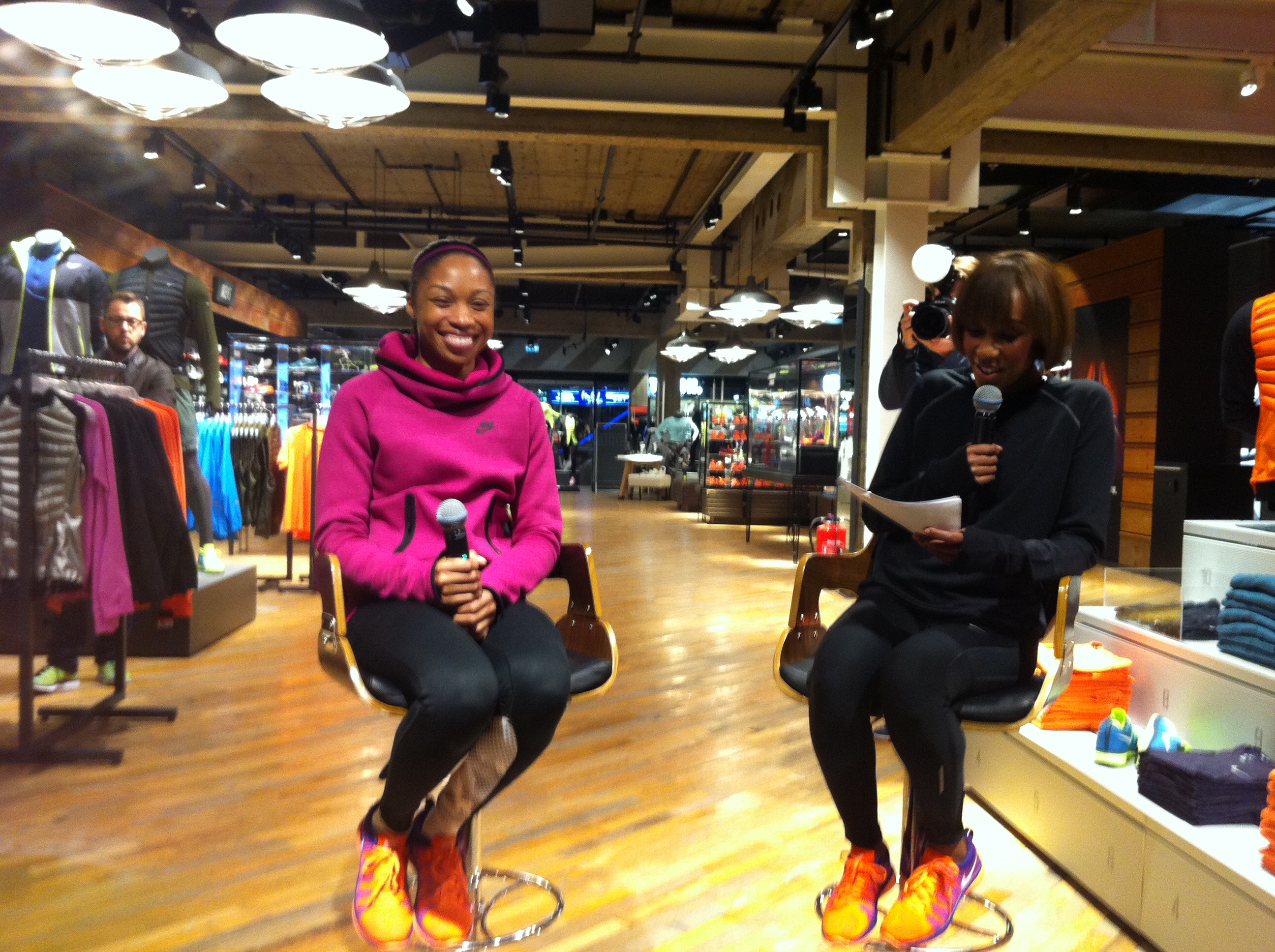 Nous voilà équipés et pressés d’aller galoper pour tester ces nouveaux produits dont nous sommes désormais les heureux propriétaires. Ça tombe plutôt bien, parce qu’il paraît qu’on nous a concocté un petit programme sportif pour finir la journée … Retour au Nike Store de Berlin en tenue de runners cette fois, flyknit Lunar 2 aux pieds. C’est bientôt l’heure du footing collectif, et pour se faire, un parcours de 7km a été tracé dans la capitale allemande. Mais avant de se jeter dans les rues sombres et fraîches, deux surprises sont annoncées. L’arrivée d’Allyson Felix sera la première, un spectacle de sons et lumières avec projection sur la façade du magasin extérieure la seconde. Musique pour nous réchauffer et rythmer nos foulées, le run est lancé ! C’est parti pour une belle balade de 7km en compagnie d’une centaine d’autres passionnés.