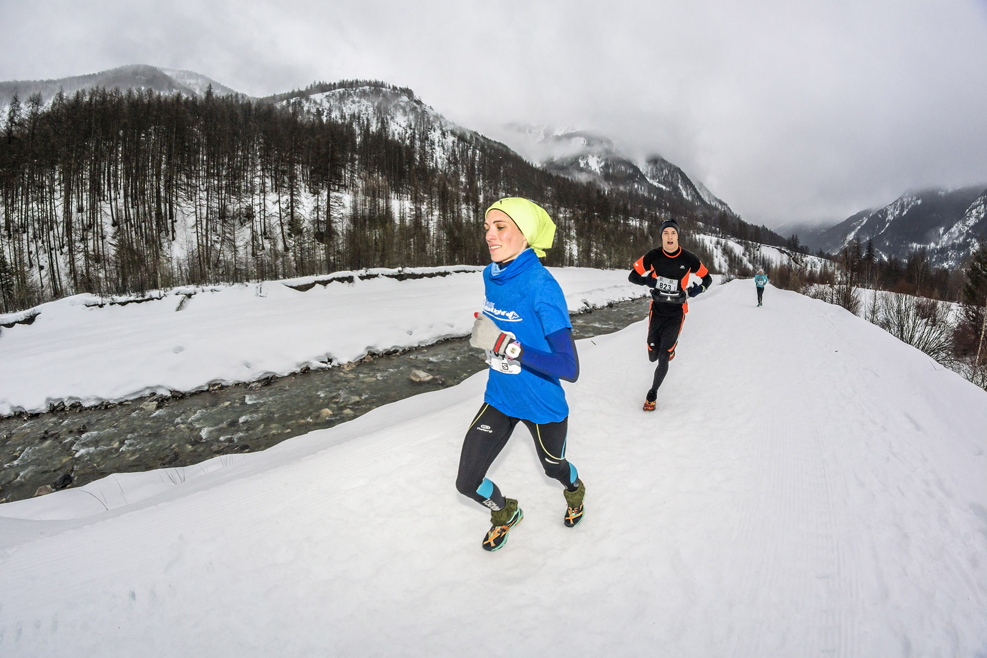 Dimanche 16 février, à Saint-Paul-sur-Ubaye, les coureurs du snow trail Ubaye Salomon ont été accompagnés par des averses de pluie et des chutes de neige en altitude. Ces précipitations ajoutées à quelques jours de redoux ont ramolli le très épais manteau neigeux. Même si un damage optimal a permis aux traileurs de courir assez souvent sur la neige, ils se sont parfois retrouvés dedans, enfoncés jusqu’aux genoux et même plus haut. Malgré ces conditions météorologiques et nivologiques les sourires étaient largement majoritaires à l’arrivée. Confirmation, s’il en était besoin du bel état d’esprit, de la force mentale et physique des traileurs.