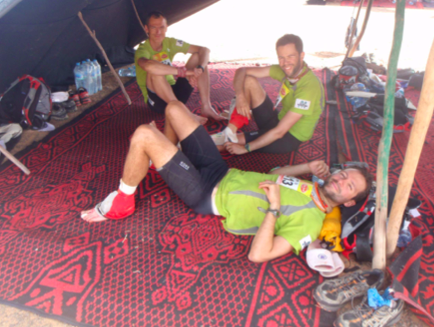 Une toile de laine tendue, 4 bouts de bois, un tapis de sol, le confort à la Berbère ! L’organisation nous met 2 choses à disposition durant toute l’épreuve : de l’eau (en quantité prédéterminée), et une toile de tente. Tout le reste est géré et porté par le concurrent, dans le principe de l’autonomie. Aussi, dès le 1er jour, un rituel organisé s’instaure : les 1ers arrivés de l’étape vont chercher de quoi faire du feu (des buissons, des racines, tout ce qui brûle…), avant que les alentours immédiats du campement ne soient dévalisés par les 1.200 concurrents. Ensuite il faut débarrasser le sol des cailloux, afin de se préparer une couche à peu près confortable, puis vient le temps de la nourriture, des massages, des étirements, et du repos… Et bien sûr le temps des soins, si nécessaire !
