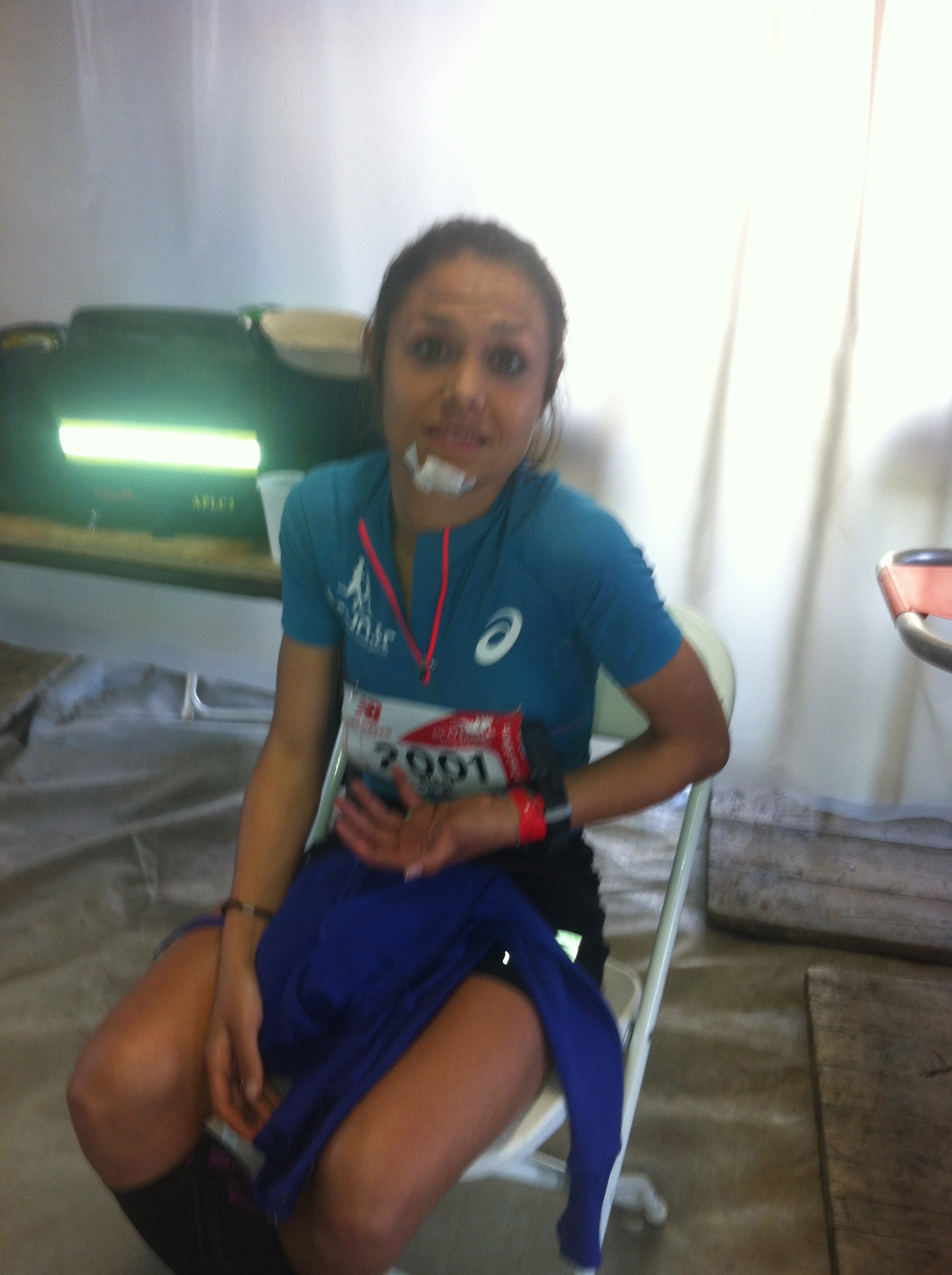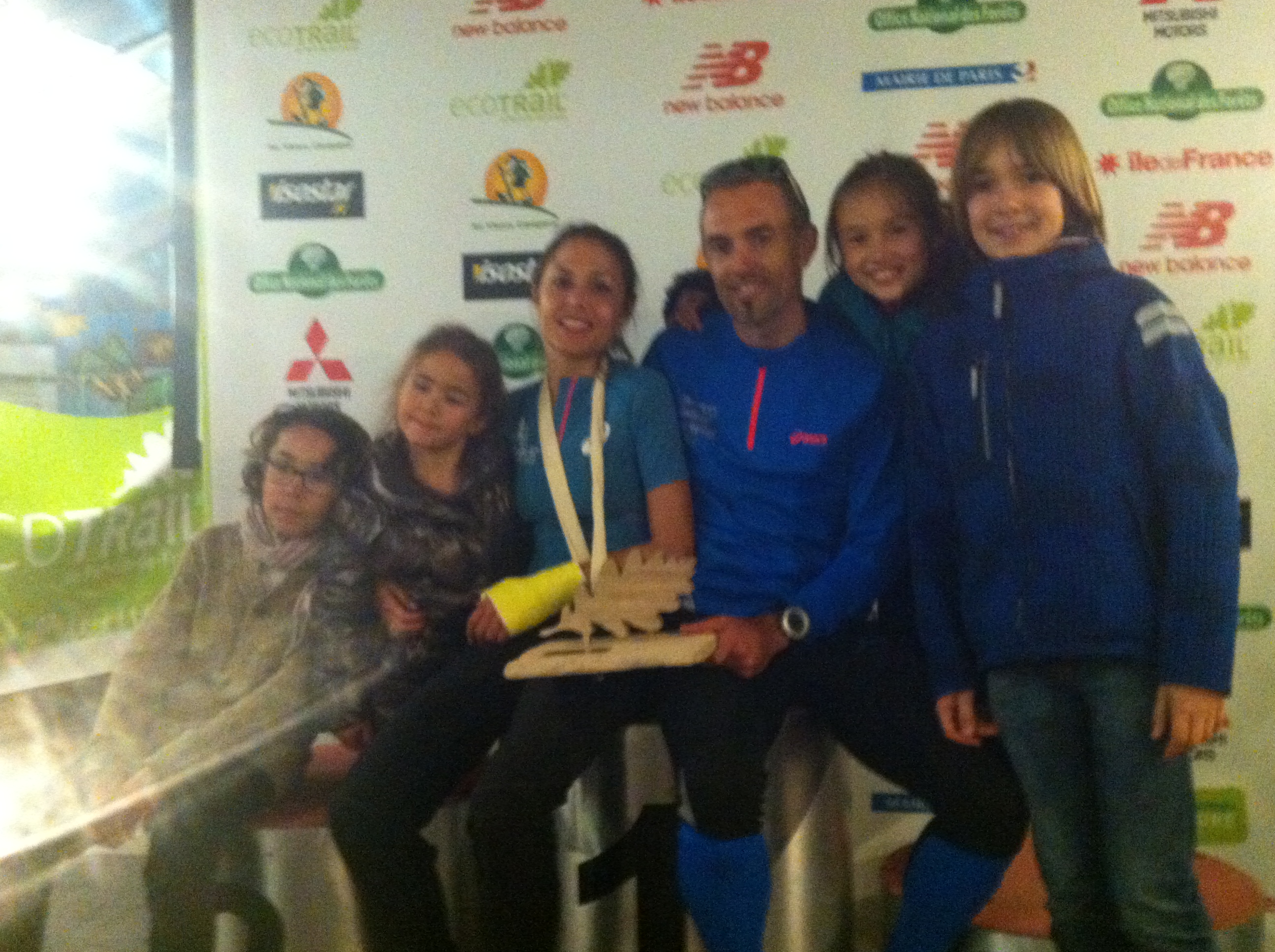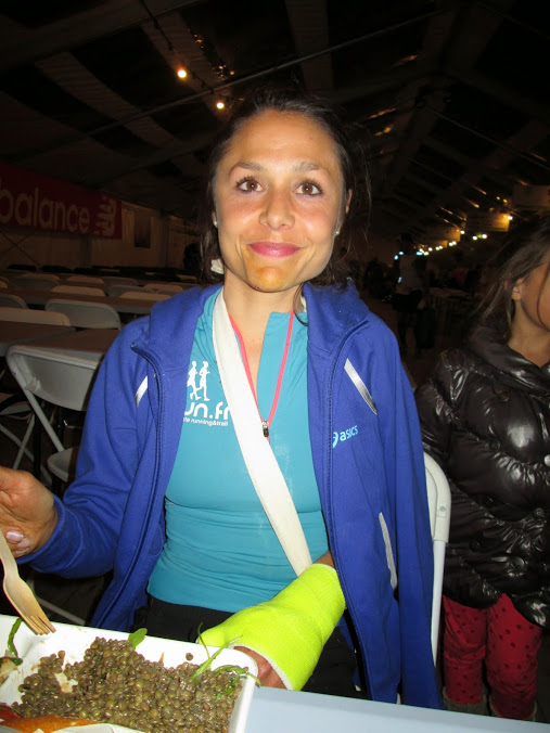 Le bilan n’est pas très glorieux : 7 points de suture au menton, un plâtre au poignet gauche (la radio montrait une belle grosse luxation, mais pas de fracture, ouf !), mais surtout une énorme frustration de ne pas avoir pu aller au bout de cette course que nous attendions tant et que nous avions si bien préparée avec Manu … Et la culpabilité d’avoir fait venir ma famille pour leur faire passer une longue journée à attendre aux urgences de Boulogne … Désolée Papa, Boris, Anna, mais surtout, merci d’avoir été là, auprès de moi, dans ces moments là. Merci aussi à tous ceux et celles qui ont pris des nouvelles et m’ont envoyé des pensées positives de soutien, cela m’a énormément touché. J’étais pressée de retrouver mon homme pour le féliciter et retrouver un peu réconfort dans ces bras.