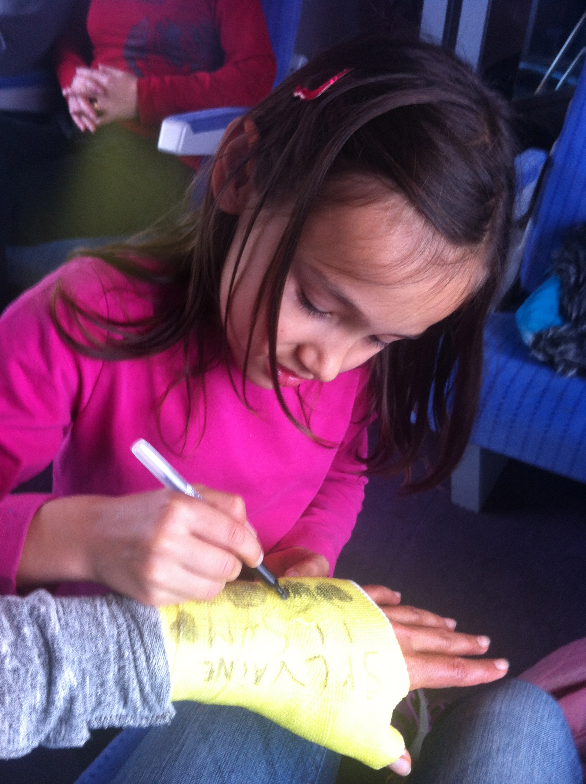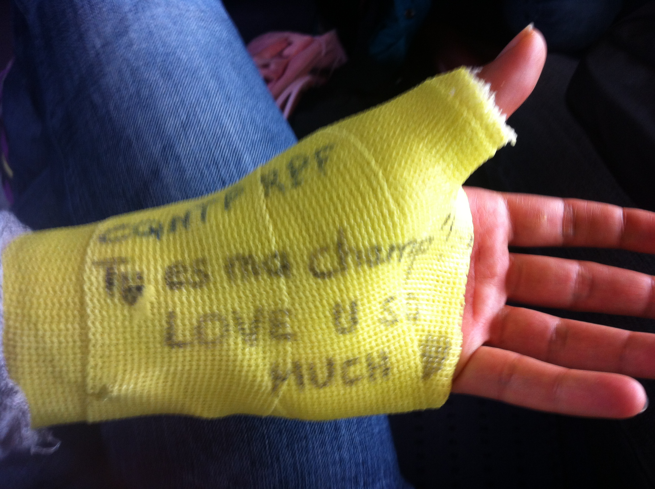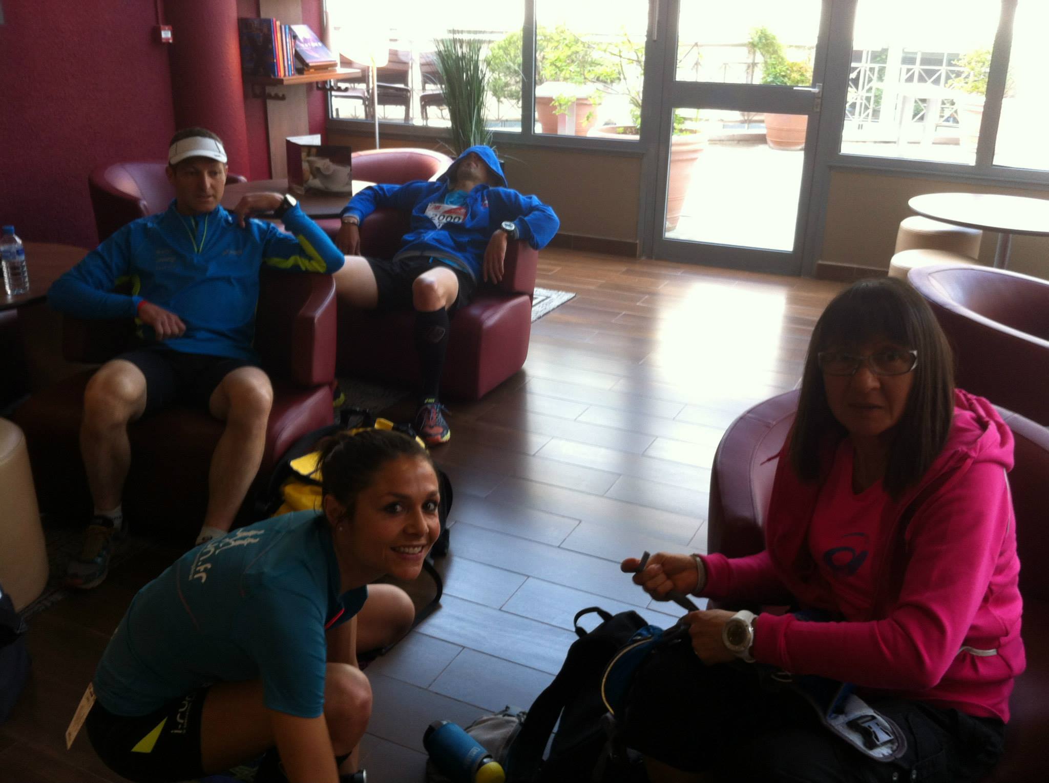 Le bilan n’est pas très glorieux : 7 points de suture au menton, un plâtre au poignet gauche (la radio montrait une belle grosse luxation, mais pas de fracture, ouf !), mais surtout une énorme frustration de ne pas avoir pu aller au bout de cette course que nous attendions tant et que nous avions si bien préparée avec Manu … Et la culpabilité d’avoir fait venir ma famille pour leur faire passer une longue journée à attendre aux urgences de Boulogne … Désolée Papa, Boris, Anna, mais surtout, merci d’avoir été là, auprès de moi, dans ces moments là. Merci aussi à tous ceux et celles qui ont pris des nouvelles et m’ont envoyé des pensées positives de soutien, cela m’a énormément touché. J’étais pressée de retrouver mon homme pour le féliciter et retrouver un peu réconfort dans ces bras.