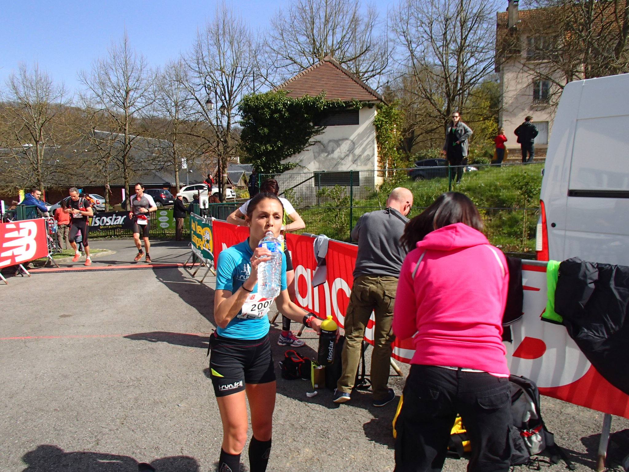 Le ravitaillement approche, on traverse quelques routes bitumées, ça commence à sentir la civilisation ! Je n’ai plus d’eau, ça tombe bien. La seconde féminine (qui s’appelle Annabelle) est toujours juste devant et on avance toujours en moyenne en 4’45/5′ au kilo. Pas de fatigue ressentie encore, pourvu que ça dure. J’aperçois (et j’entends) Gloria qui encourage les coureurs juste avant l’entrée dans la zone de ravitaillement : »allez Sissi ! » (merci Gloria !). Ça fait du bien tout ce monde. Hop hop Cathy et Laurent assurent parfaitement leur rôle d’assistance, comme d’hab (merci à eux !); Je récupère deux bidons pleins, un gel Actifood d’Isostar (sans vouloir faire de la pub, c’est super bon ces trucs là !), une barre, et c’est reparti ! Le temps quand même de dire que tout va bien et de prendre des nouvelles de Manu qui semble gérer avec le groupe de tête, super, j’espère qu’il tiendra bon.