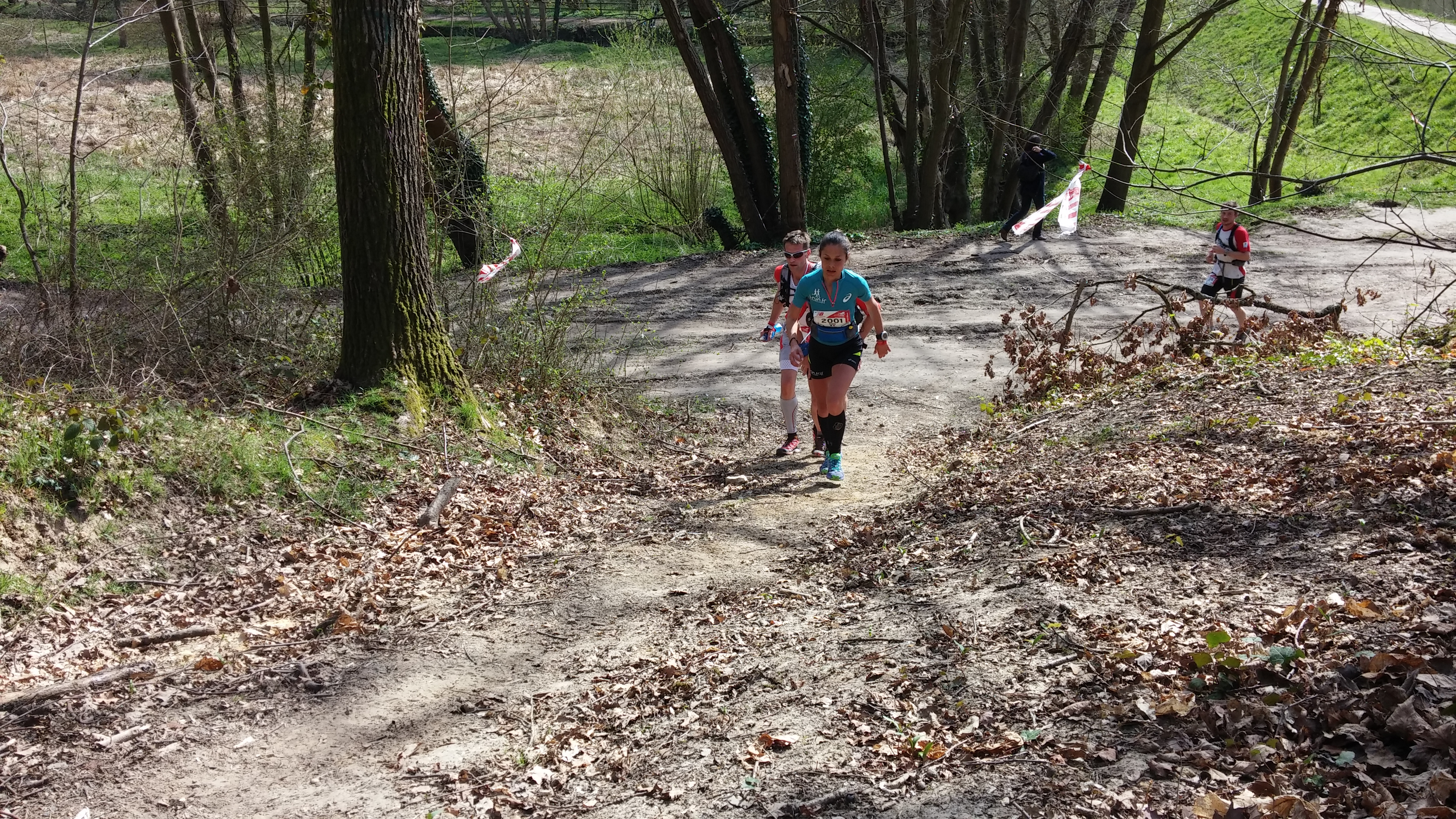 Ça grimpe, je ralentis mais continue à courir. Un coureur arrive à mon niveau et m’encourage : »La famille qui supporte, ça doit faire du bien ! » Oh que oui je lui réponds ! Ah mais c’est Eric, le mari d’Isa ! On fait un petit bout de chemin ensemble, je le préviens : « j’ai trouvé mon allure, je pense que je ne vais pas accélérer par contre, la route est encore longue ! » Ça tombe bien, il me dit que lui non plus ! Plus loin, il tourne à gauche alors que le balisage nous indique la droite, mais je comprends rapidement qu’il a besoin d’une pause pour un p’ti besoin naturel ! Perso, je suis tranquille de ce côté là et ce n’est pas pour me déplaire … Je me retrouve seule du coup, le sentier est étroit dans le bois, tourne et avec quelques racines au sol, c’est top, je me régale ici, j’accélère un peu, un moment solitaire mais agréable !