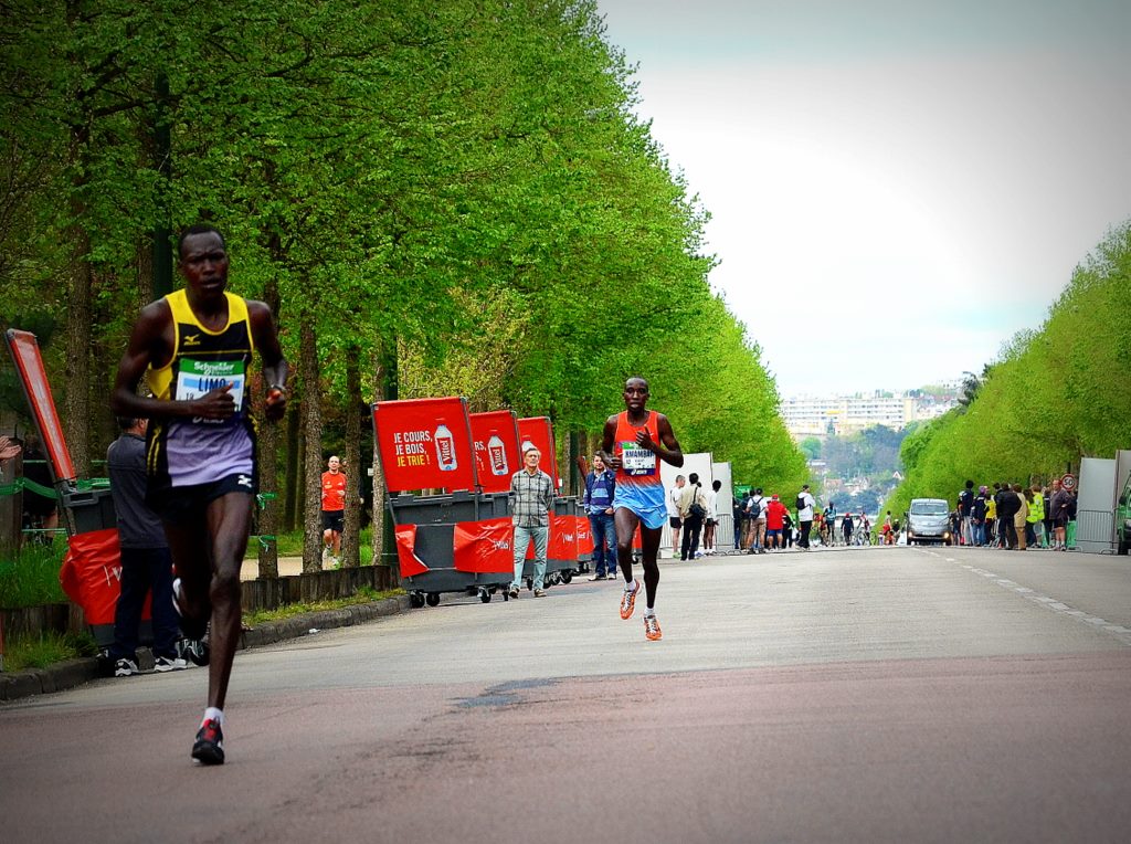 Le soleil était présent même si dans l’idéal on veut toujours plus de fraîcheur. Un peu bas sur les visages des coureurs en début de course. Bekele voulait partir en 2’55 ? 1er kilo en 2’56, le train était bien lancé. On ne verra pas longtemps l’homme au t-shirt rayé, ni les quelques spectateurs en short qui ont tenté quelques secondes de tenir plus de 20kmH … n’est pas athlète de haut niveau qui veut. L’éthiopien, maintes fois vu sur piste à des allures folles, tenait la même foulée à la fois tonique, maîtrisée, élégante et légère, nous l’avons revue sur le bitume parisien, mais tout en contrôle. On sent l’homme venu pour s’ouvrir les portes du marathon en grand. Il est concentré. Autour de lui, quelques kenyans et éthiopiens qui ne bronchent pas, le tempo est très satisfaisant.