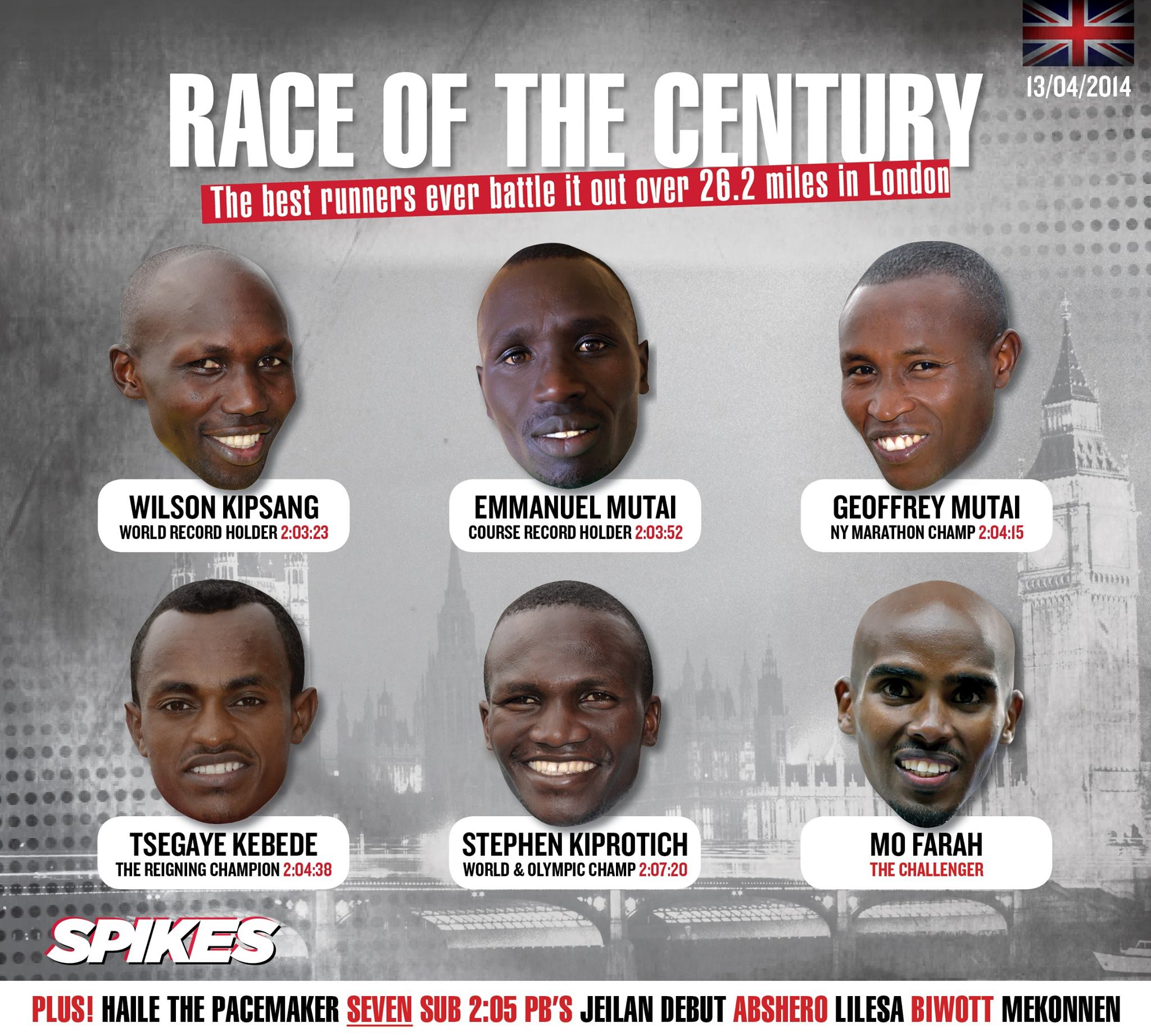 Mo Farah : Mo, son premier marathon, sur ses terres, face à une horde de marathonien supersonique et expérimenté. Drôle de première ! Va-t-on assister à une course d’attente ? Sûrement, ils ne connaissent que trop bien son finish. Mo va devoir s’attendre à des secousses terribles de ses adversaires, et nous verrons donc sa résistance. On comparera alors son chrono avec Bekele même si les configurations et les parcours sont différents.