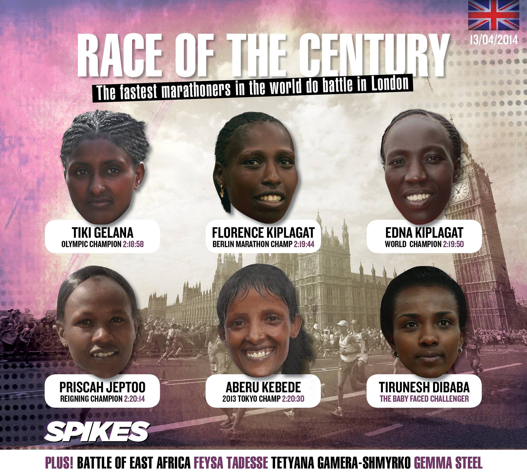 Edna Kiplagat : déjà 2è à Londres en 2012 (record personnel établi 2h19’50), elle a aussi gagné New York en 2010 et elle est double championne du monde du marathon (2011 et 2012). Expérimentée et performante !