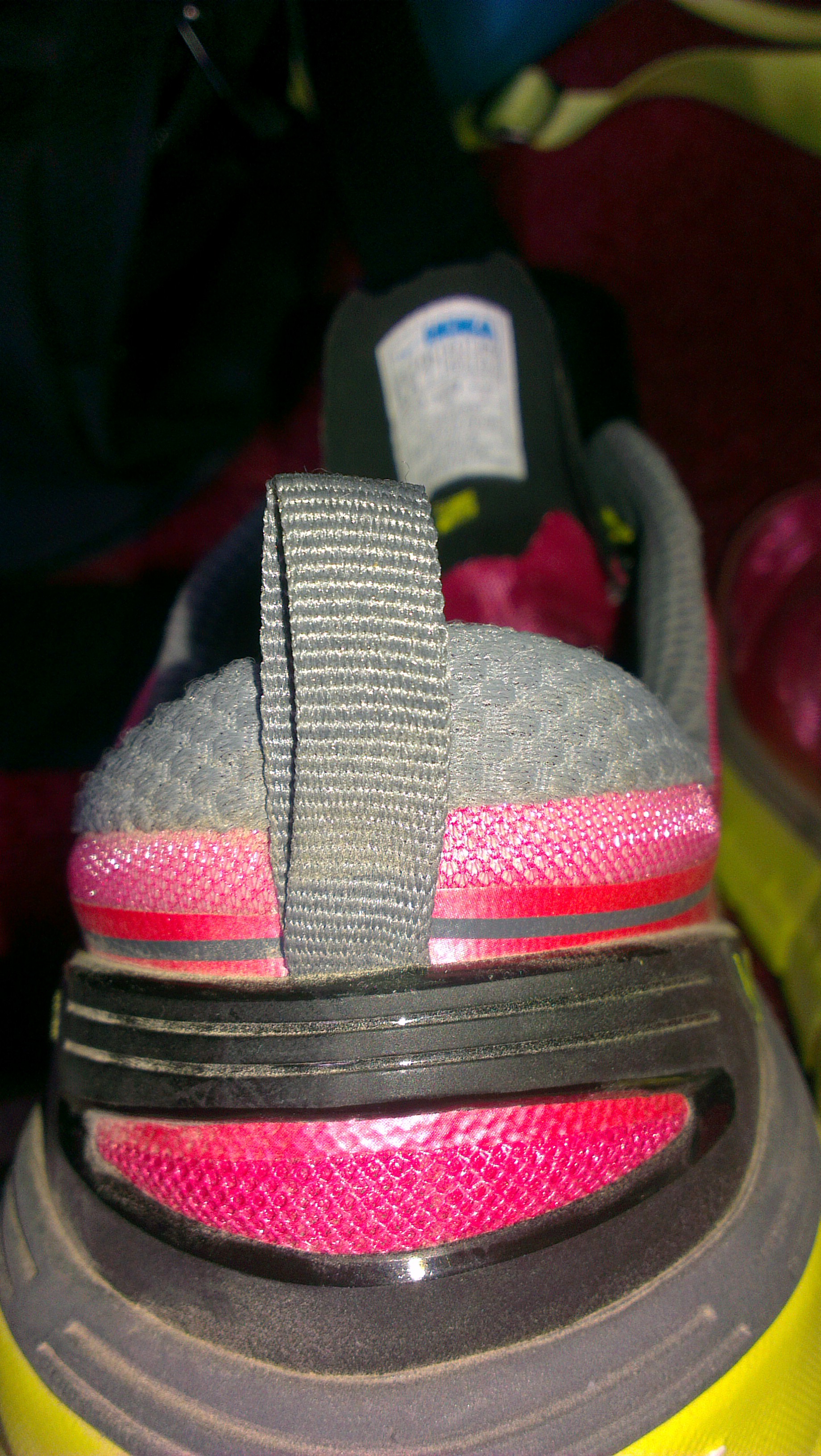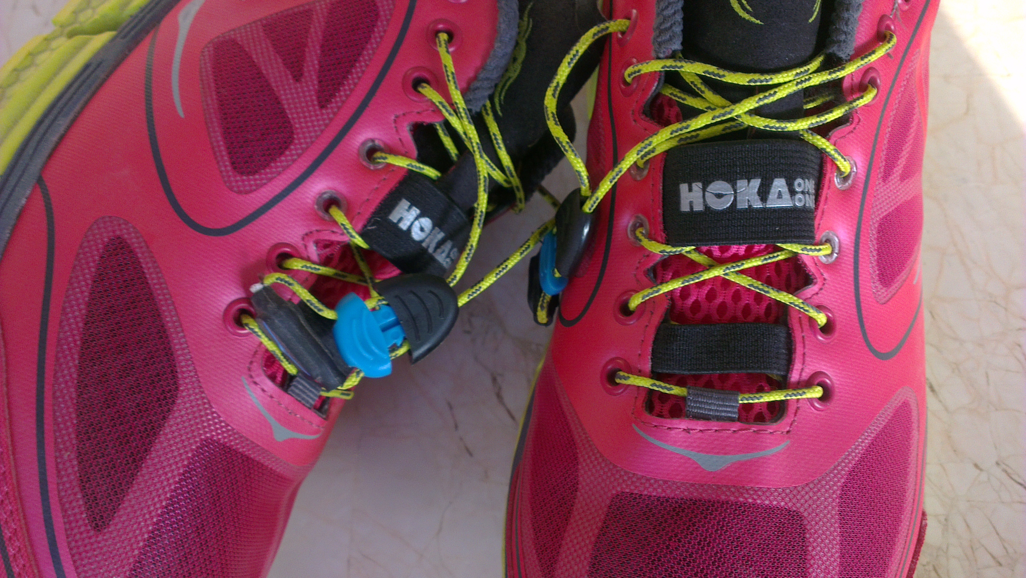 Les lacets sont de type Quick fit sytem, on s’imagine, bien à tord, que ces lacets ne vont pas rester serrés correctement pendant l’entraînement, erreur, ils ne bougent pas d’un poil, c’est très pratique comme laçage. Il est également fourni une paire de lacets standards mais comme il faudrait couper les lacets en place pour installer les autres, le retour en arrière serait impossible. La languette au talon pour aider à l’enfilage n’est pas aussi pratique que sur le modèle que j’utilise (Kalua). C’est un petit détail mais qui a son importance.