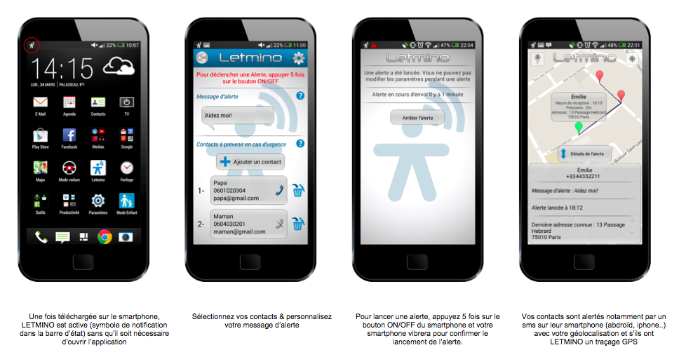 LETMINO est une application brevetée révolutionnaire pour smartphones Androïd qui permet de lancer une alerte pour prévenir instantanément ses proches qu’on est en situation d’urgence, sans avoir à déverrouiller l’écran ni même à le regarder, sans avoir à ouvrir une application et même si le smartphone est en veille : simplement, discrètement et rapidement en appuyant cinq fois sur le bouton ON/OFF du smartphone !