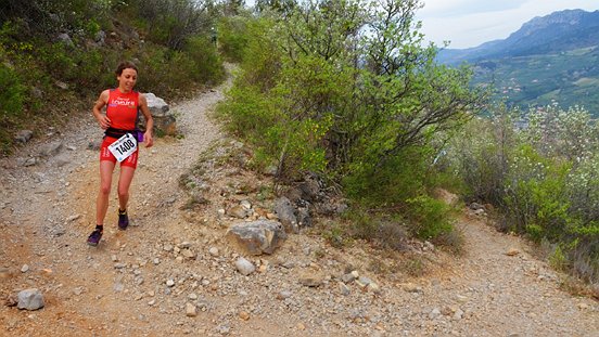 Arrivée à Buis, très bonne ambiance, il a du monde ici ! Les encouragements sont nombreux et motivent, merci ! Le coureurs du 24km partent à 10h, je suis à environ 2h30 de course, il est donc aux alentours de 9h30, ce qui explique cette effervescence … On est bien ici avec toute cette chaleur humaine, mais il faut repartir, il reste de la route et pas le plus facile ! Un coucou à Agnès la photographe toujours fidèle au poste, Philippe Propage, Olivier Gui, je croise aussi Seb qui s’échauffe … De quoi se motiver pour entamer la seconde partie. Le parcours suit la route puis bifurque rapidement vers un sentier étroit, qui grimpe fort ! Allez, je décide de marcher, mains sur les cuisses, on appuie ! Une belle et longue montée, abrupte au démarrage puis plus douce jusqu’au 31ème kilomètre, dernier point de ravitaillement, pour repartir vraiment bien pentue jusqu’au sommet, le 34ème kilomètre. Je ne me suis jamais faite doubler par une féminine depuis le départ à 7h, elles étaient 4 devant, donc logiquement, je suis restée à ma place, toujours 5ème.