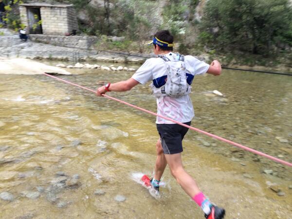 Bref, on repart et je ne suis d’ailleurs pas la seule à chuter, j’aperçois des coureurs qui prennent quelques gamelles devant et l’un d’eux est arrêté, le genou en sang, il n’arrive même plus à le plier. Les secours sont en route a priori, il va pouvoir être soigné (il aura même pu reprendre sa course puisqu’il me redoublera plus loin ! bravo !) La suite de la descente se passe sans accro, il faut dire que j’ai bien levé le pied ! Manu s’échappe devant moi, il a décidé de se faire un petite pointe de vitesse jusqu’au point de ravitaillement. Je comprends, il doit s’ennuyer à mon rythme …! Juste avant d’entrer dans le village, une petite surprise nous attend : une rivière … je regarde le signaleur qui nous oriente : « euh, c’est ici qu’on passe ? On traverse dans l’eau quoi !! » Oui oui. Ok, original. Les pieds trempés, mais ça rafraichit, c’est pas si mal, il commençait à faire chaud. Les coureurs qui s’apprêtent à prendre le départ du 24km s’échauffent, on les croise dans tous les sens, Benoît et Manu du Team Asics m’encouragent (merci les gars !).