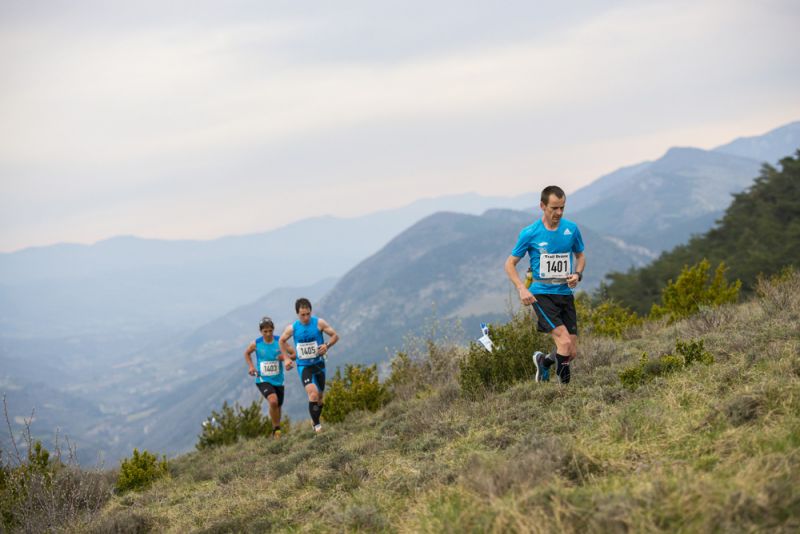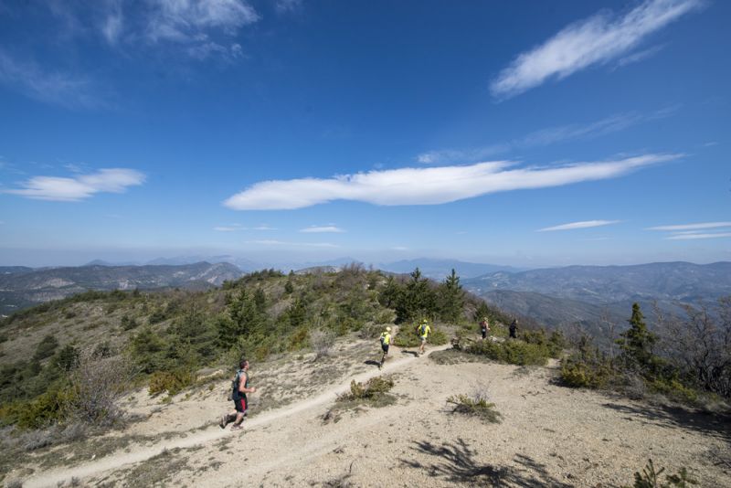 Il va faire chaud, tenue d’été de sortie, aucune hésitation possible ! On prend quand même le temps de faire quelques foulées avant de s’élancer, dossard épinglé et on s’entasse sous l’arche de départ. Ouf, le jour s’est levé, j’ai bien cru qu’on allait devoir partir avec la frontale à un moment donné ! 7h, le coup de feu retentit, c’est parti pour quelques heures en plein cœur des Baronnies provençales, au milieu d’une végétation méditerranéenne typique (champs d’oliviers, de lavande et d’abricotiers), miam ! J’ai une seule chose en tête à ce moment là : prendre du plaisir et allonger si le terrain le permet oui, mais surtout ne pas jouer avec le chrono ou la performance et faire une course prudente pour ne pas me faire mal. Objectif du jour : ne pas chuter !