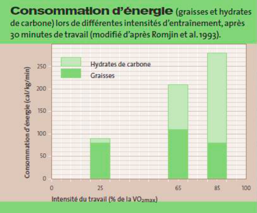 On observe nettement sur le graphique 4 et 5 combien l’utilisation préférentielle des glucides, des lipides, voire des protéines dépend de l’intensité de l’exercice.