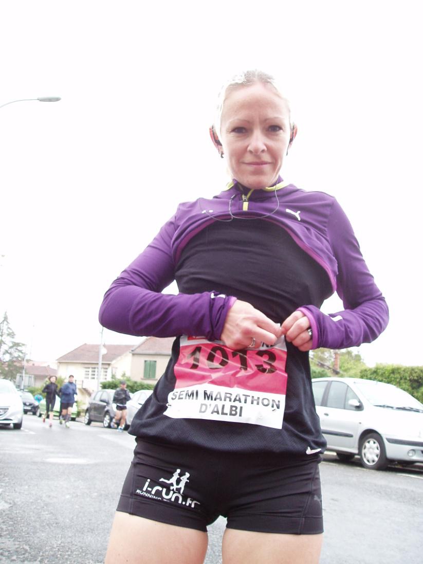 « Le semi d’Albi, pourquoi… ? Car j’aime cette ville, l’ambiance y est sympa, l’organisation est au top et il y a des applaudissements tout au long du parcours ! Et puis j’y ai fait une bonne course une fois, je me dis que c’est ma course. Bah pas cette année. Avant même de partir, j’étais déjà fatiguée…la semaine passée au travail n’avait pas été de tout repos. J’ai eu mal aux jambes toute la semaine. Mais j’étais motivée, donc j’y suis allée. Le matin de la course, pluie et vent, pas cool comme condition. Je vois les copains mais je suis fatiguée ! Allez, pendant la course ça ira mieux. L’échauffement se passe bien et en musique. Je vais sur la ligne de départ en espérant y retrouver quelqu’un pour prendre ma veste. (on s’était donné rdv….mais apparemment, pas du même côté) Du coup, je suis partie, veste autour de la taille, clé de voiture, pas top…mais bon, y’a pire !