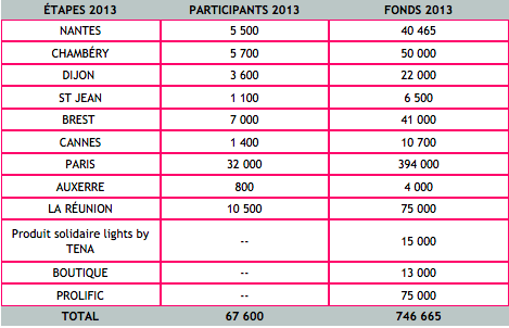 • 15 000 euros : en 2013 le Produit solidaire lights by TENA s’est vu attribué cette somme pour permettre à 4 femmes de vivre au mieux leur réémission