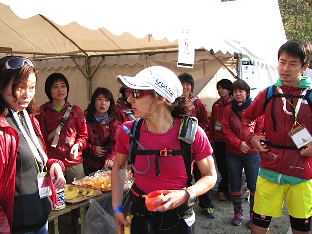 Et puis finalement ça c’est plutôt bien enchaîné ! J’étais partie sur un plan très ambitieux en 25h30… Jusqu’au 100e km, j’étais bien dedans et puis je ne me suis pas assez méfiée de la « montagne des anges »… J’ai pris une heure de retard dans cet enfer vert, rude, très escarpé, très encombré de racines !!! A partir de là, il me fallait tenir… J’ai été bien aidée, réconfortée et nourrie par mon team franco-japonais (mon compagnon et un groupe d’amis japonais rassemblés et motivés pour me suivre tout au long de la course), à chaque point de ravitaillement.