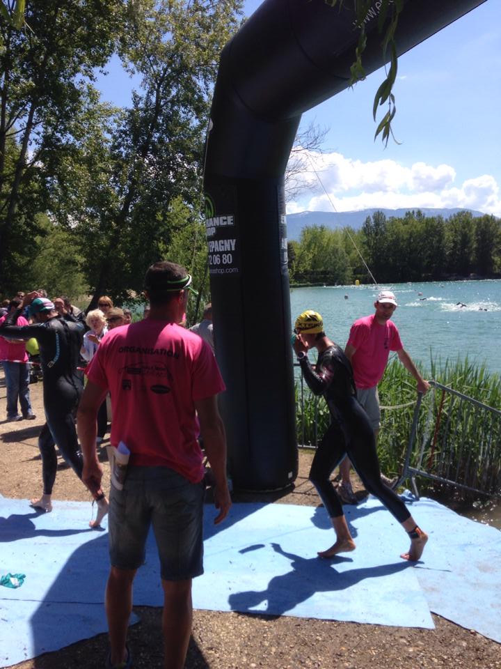 Le jour de la course un grand soleil, des conditions parfaites ! Le petit plan d’eau a pu se chauffer jusqu’à 18 degrés- le luxe. Départ à 12h pour environ 350 athlètes. Je pars devant et trouve de suite ma place. J’essaye de bien placer ma nage, de bien appuyer et je me régale vraiment, j’aurais envie de nager des kilomètres….! Mes sensations ne me trompent pas, je sors 20eme et première fille, à 1:30 de la tête ( comme quoi parfois : je n’ai pas nagé depuis 2 semaines car la piscine était fermée ! On peut vivre sur ses acquis…).