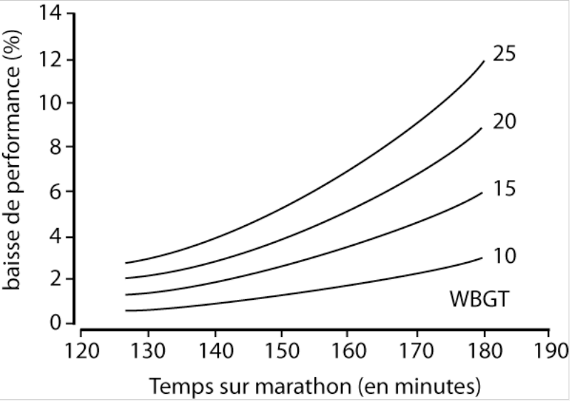 Le graphique ci-dessous, tiré d’une étude d’Ely et al. (2007) et repris par le site www.courir-plus-loin.com montre le pourcentage de baisse de performance en fonction du temps réalisé sur marathon et de conditions climatiques différentes définies par l’indice WBGT. L’indice WBGT intègre le facteur température ainsi que plusieurs autres paramètres comme l’humidité, le rayonnement solaire, ou encore le vent. Plus l’indice WBGT est élevé, plus les conditions de course sont difficiles.