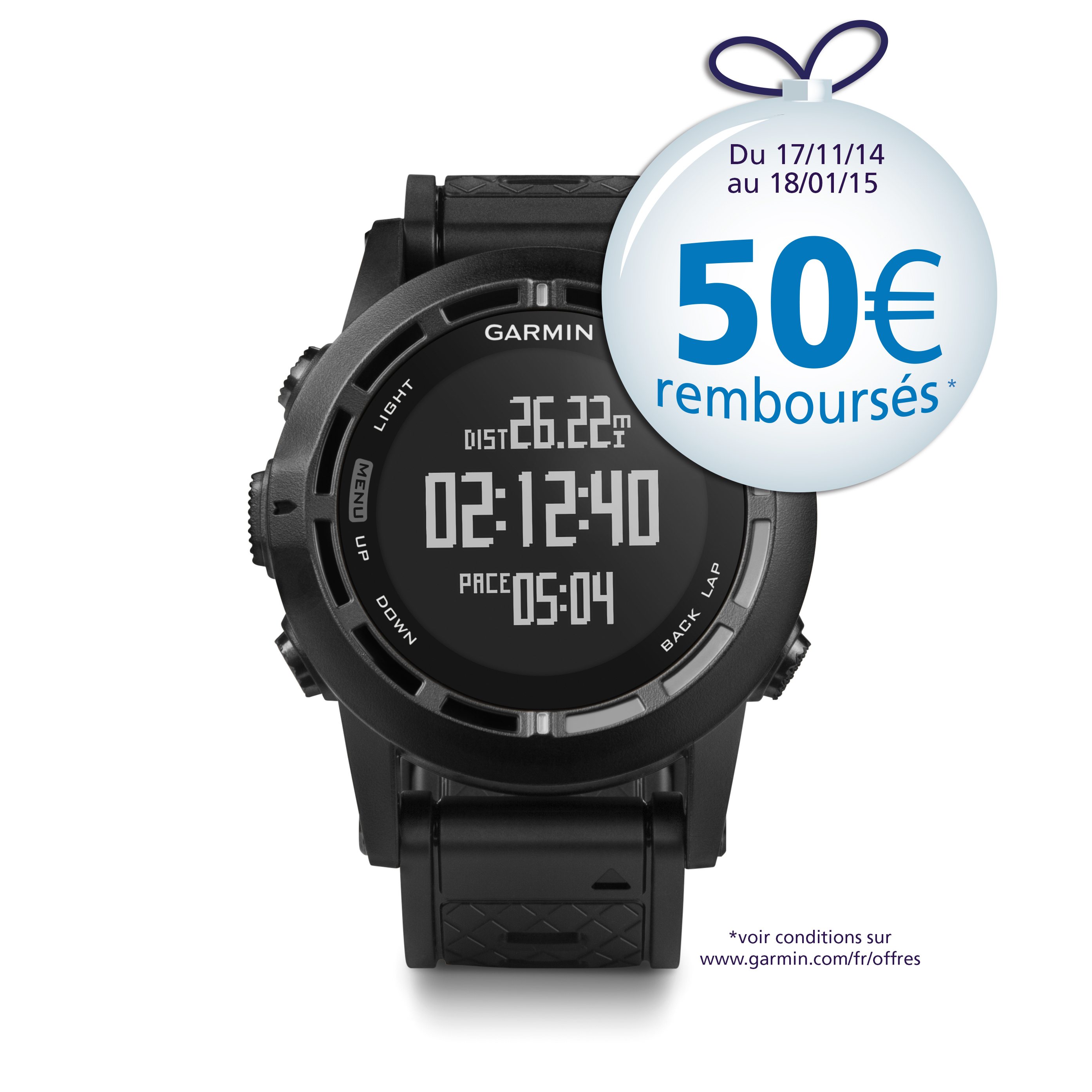 Ainsi, du 17 novembre 2014 au 18 janvier 2015, vous pouvez bénéficier d’une offre spéciale : pendant cette période, GARMIN vous rembourse jusqu’à 50 € pour l’achat d’une sélection de produits de la gamme RUNNING/TRAIL.