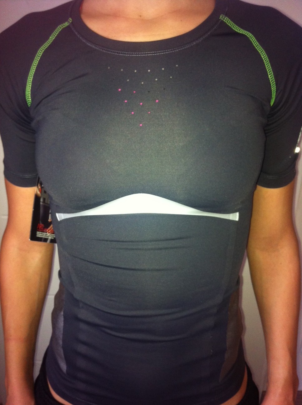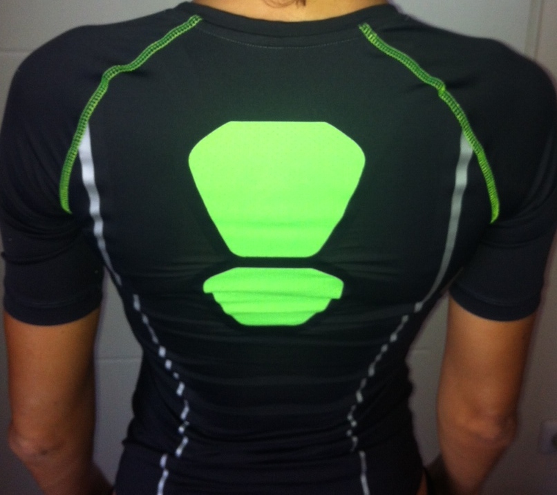Les coloris sont vraiment classes et rendent le tee shirt moderne, sans être exubérant. Gris foncé avec quelques rappels vert-fluo. C’est chouette ! Sur chaque côté, des empiècements réfléchissants pour assurer une bonne visibilité en cas de footings nocturnes. Au niveau de la poitrine, des perforations au laser discrètes, permettent une meilleure aération.