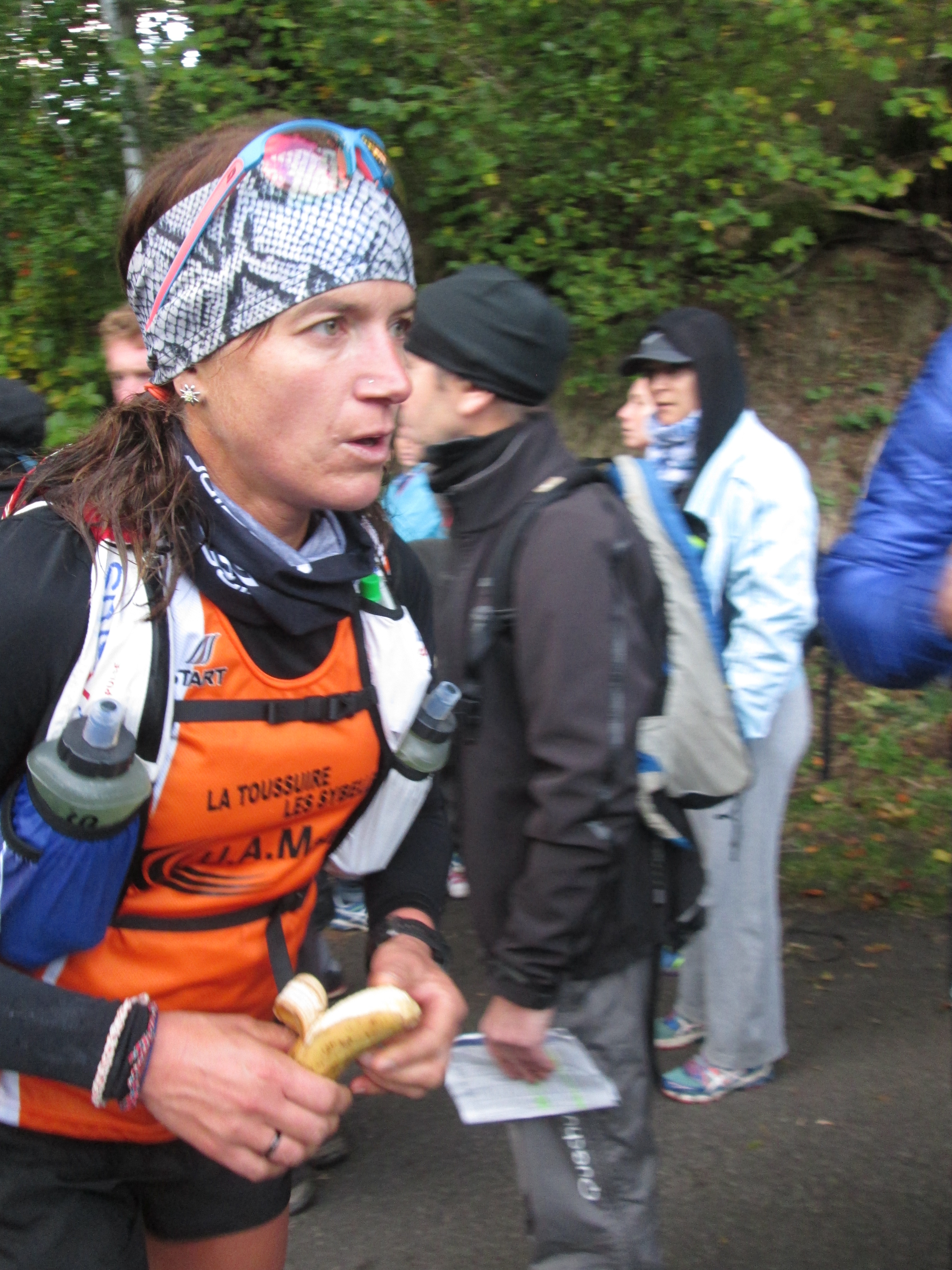 Au moment de reprendre la route à la sortie du ravitaillement, j’entends une voix familière : »Sissi, c’est moi ! » Han, non, c’est mon Manu ! Mince, il n’est pas bien, il a jeté l’éponge, il m’a attendu au ravitaillement. Je lui propose d’essayer de continuer un peu avec moi, il accepte, chouette ! Nous voilà donc repartis ensemble à se raconter nos petits soucis. Je suis triste pour lui, je sais qu’il va être déçu … Il m’encourage, c’est bon de l’avoir à mes côtés au moment où je passe dans une phase de moins bien. J’essaye de me forcer à manger mais ça me donne la nausée, j’ai le ventre en vrac et je dois m’arrêter plusieurs fois sur le côté (les joies du trail !!). Je sais qu’Émilie Deronzier est juste devant moi, je l’aperçois à plusieurs reprises.