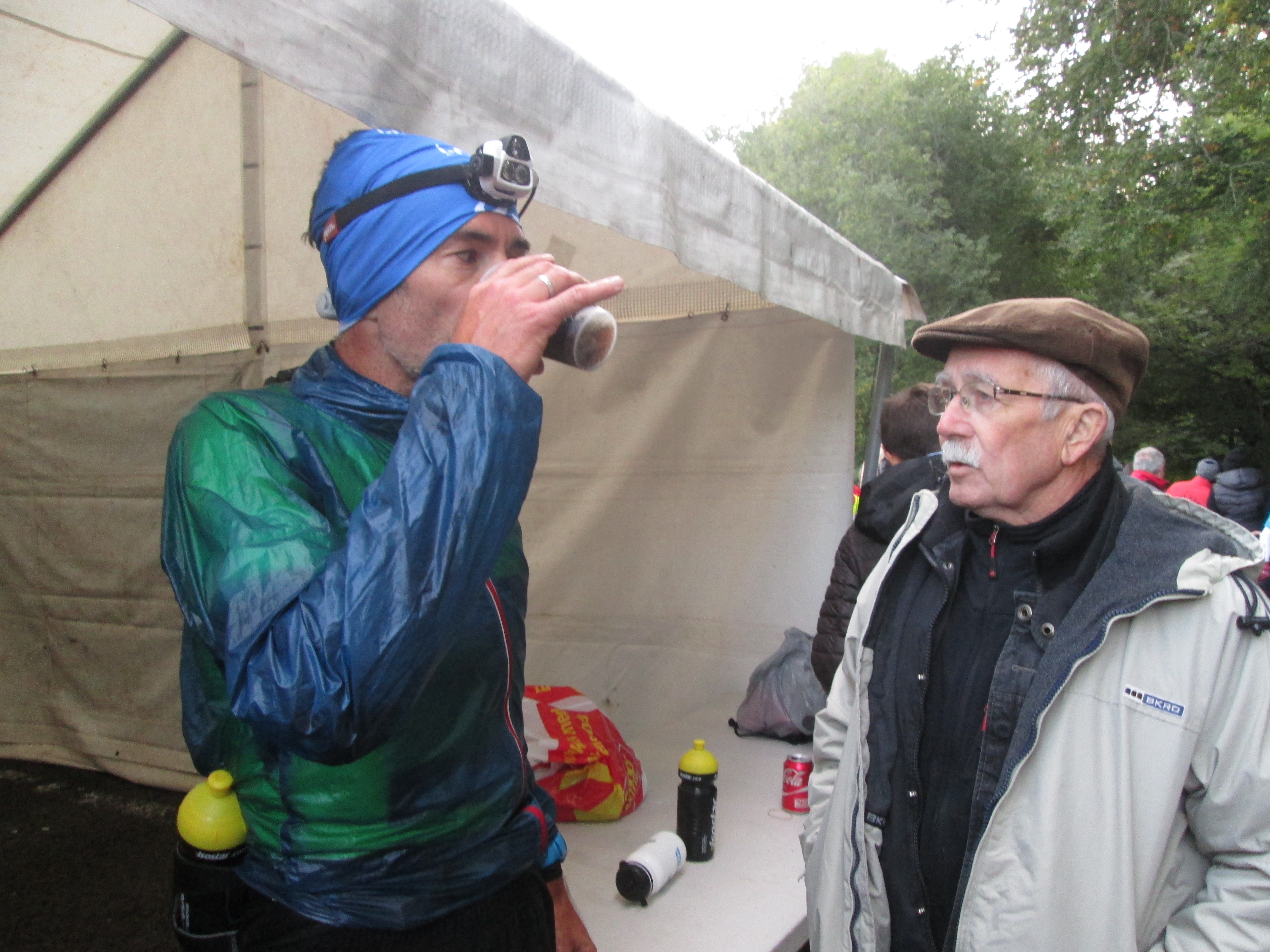 Encore un 20/20 pour mes assistants, qui assurent comme des chefs. Papa me propose de changer de chaussures : »merci papa, ça va aller, je pense que je vais finir avec celles ci, les ampoules ne se manifestent pas, on ne change rien ! » Il n’oublie pas de me retirer la frontale de mon front, qui commençait d’ailleurs à me faire bien mal au crâne. Il a les larmes aux yeux tellement il est ému, aaaaah mon papou !! Un gros bisou et on repart sur les sentiers. Manu prend le temps de papoter avec ses parents, présents également, et me recolle assez rapidement au final, ça grimpe !