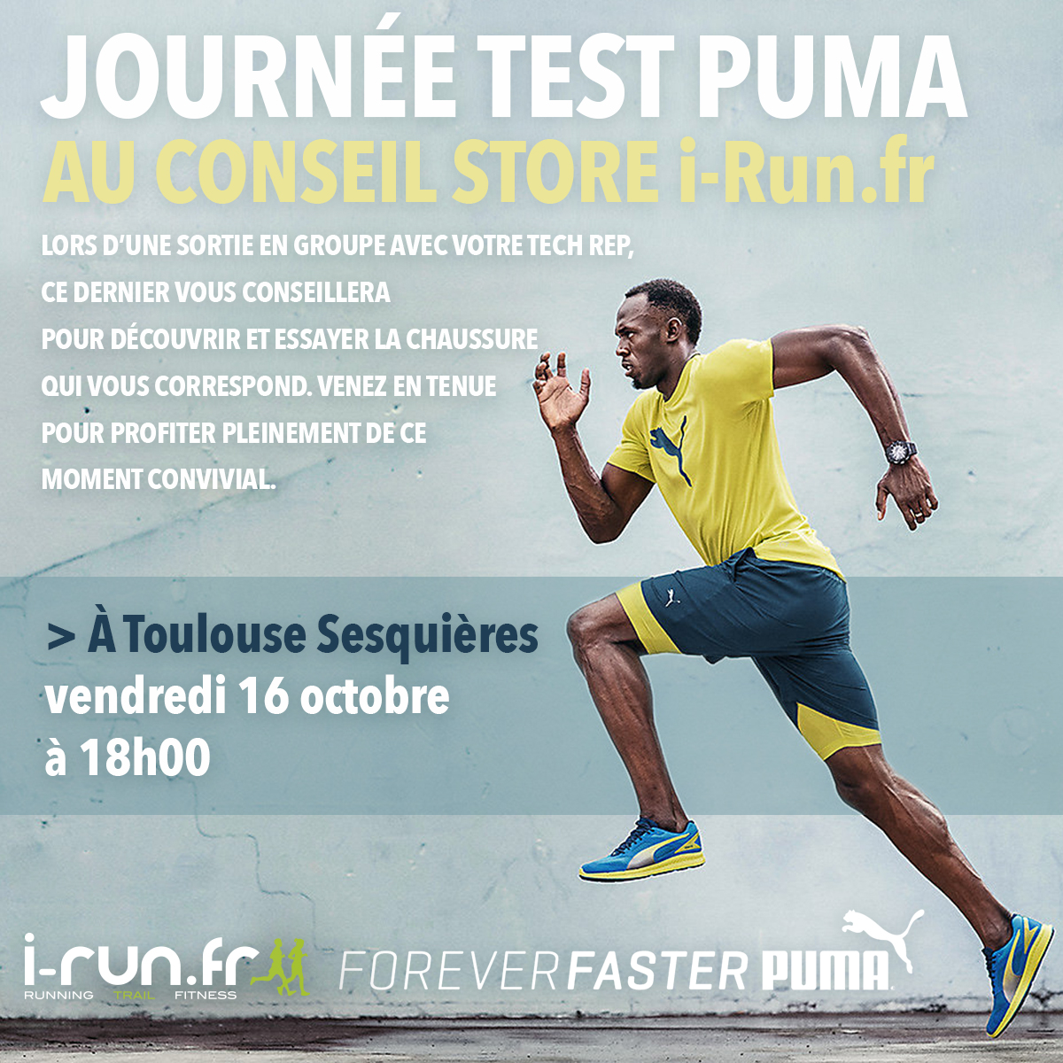 L’équipe professionnelle de PUMA sera là pour vous accueillir, vous conseiller et éventuellement orienter votre choix de chaussure. Une sortie running en extérieur permettra ensuite de tester le produit en conditions réelles. Venez en tenue de course bien sûr ! Au choix, deux sessions sont organisées : à Labège le jeudi et à Sesquières le vendredi. Pensez à vous inscrire à l’une des deux sessions sur le site dédié.