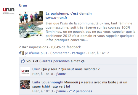 Suite à nos précédents articles sur les courses féminines et la Parisienne qui s’est tenue aujourd’hui -11 septembre 2011-, Laila qui nous suit sur Facebook s’est manifesté pour nous dire qu’elle allait y participer.