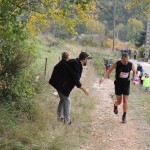 Nous arrivons très vite à saint André de Vezines et les écarts sont encore maigres. Rien n’est perdu, loin de là ! Ravito express avec Laurent et Kty, comme d’hab’ et c’est reparti ! Même si l’allure est vive, les jambes tournent très bien et je me sens encore très frais. Tant mieux parce qu’il reste du boulot ! C’est Arnaud qui prend l’allure à son compte dans le long faux plat qui descend après Saint André et dans la petite bosse qui suit. Jonas décide ensuite d’accélérer très franchement dès le sommet. Peut-être sent il que la course est en train de se jouer… Je lui emboîte le pas quelques kilomètres mais dans la descente qui mène à la Roque, il me prend quelques secondes en prenant tous les risques (que je ne prendrai pas!).