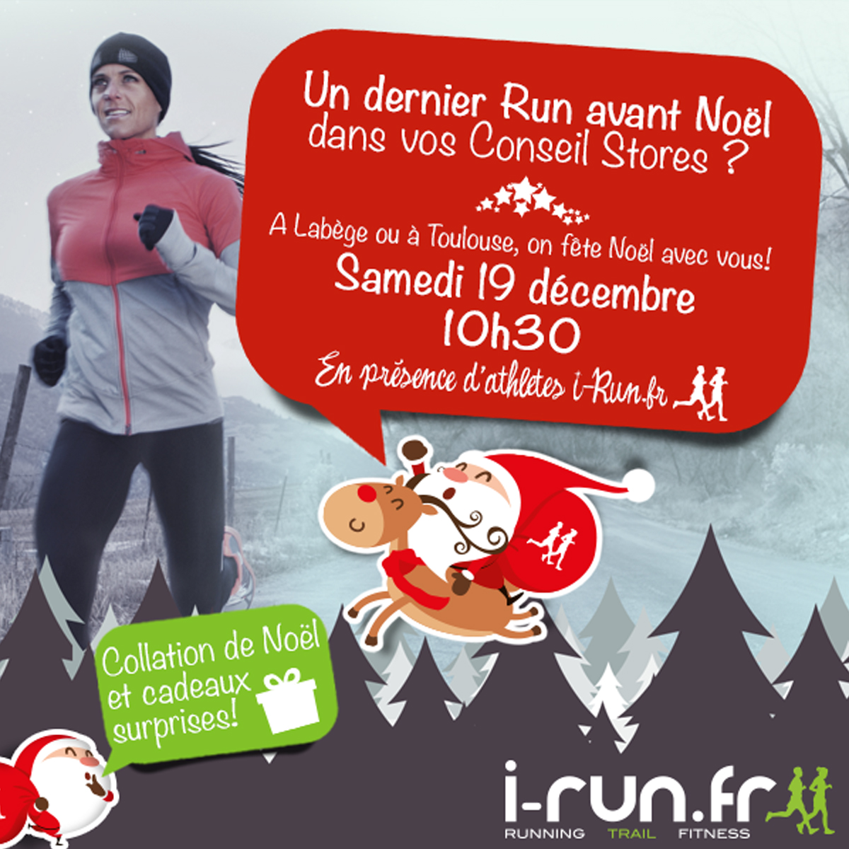 i-Run.fr vous propose un dernier Run avant de commencer le marathon des fêtes de Noël ! Le samedi 19 décembre, retrouvez toute l’équipe et les athlètes i-Run.fr dans l’un de ses deux Conseil Stores de Toulouse (Labège ou Sesquières) pour un footing collectif.