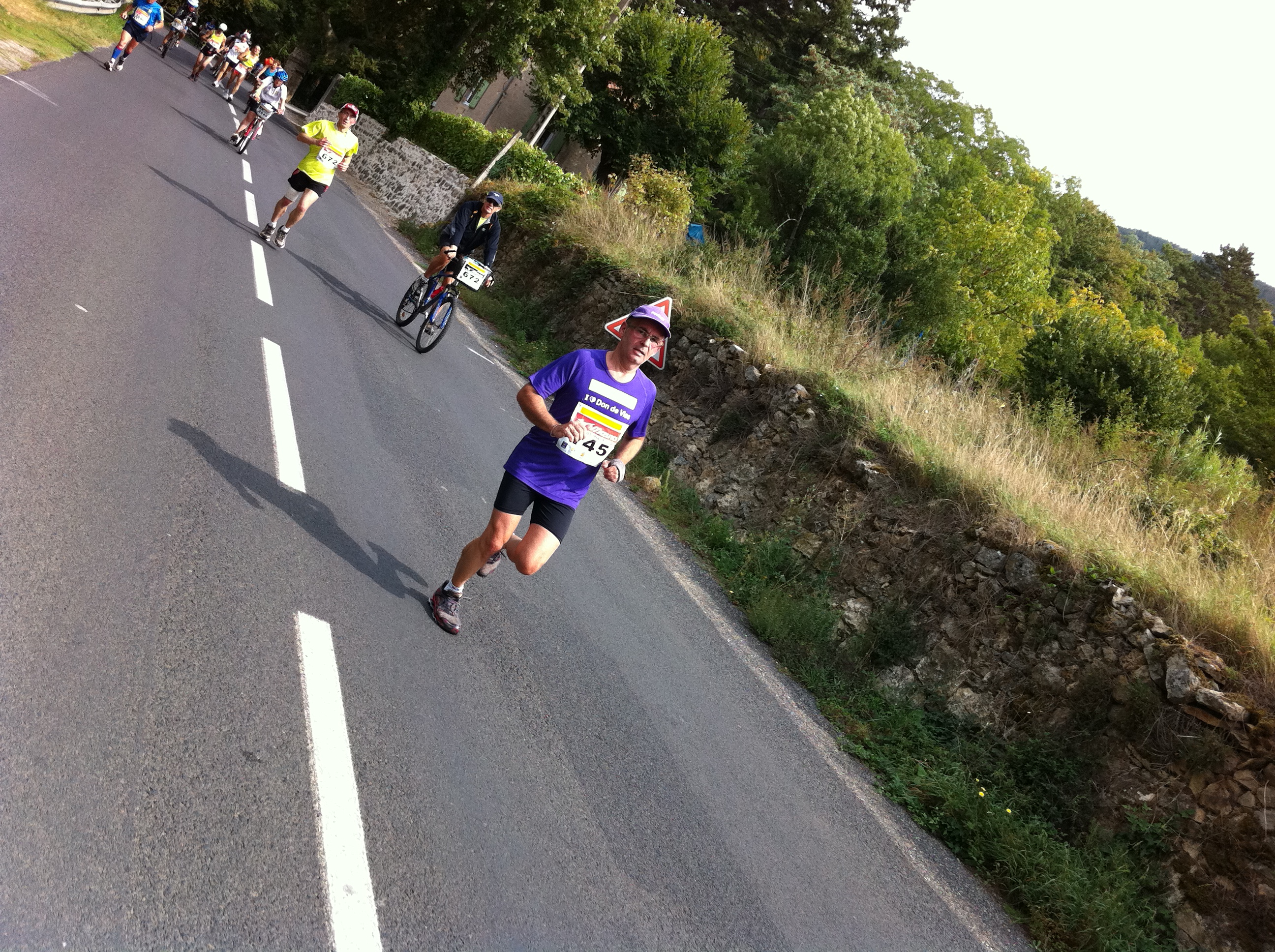 Un an où malheureusement mon suiveur attitré se blesse gravement en chutant d’une échelle en juin 2011 ; pour lui, Millau, c’est mort. (mais aujourd’hui il récupère très bien et tant mieux) , en juillet une côte cassée en se chamaillant avec ma fille dans la piscine, certes ça fait mal, mais je suis incassable psychologiquement ;Millau , je vais le faire quoiqu’il arrive en hommage à mon père disparu, et en portant les couleurs de l’association Laurette Fugain, le violet me réussit et je crois fort en leur combat.