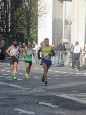 J’ai oublié ma mésaventure et je suis déjà dans ma course. Au km 2, Joao et Yoaan reviennent sur moi. Ils courent leur premier marathon. Yohan sait que j’envisage de partir entre 3’42 et 3’45/km sur les 10 premiers kilomètres et a décidé depuis longtemps de courir avec moi. Joao lui est un peu plus fougueux et décide de partir sur les bases de 36’30/36’40 au 10 km. C’est plus risqué pour lui.